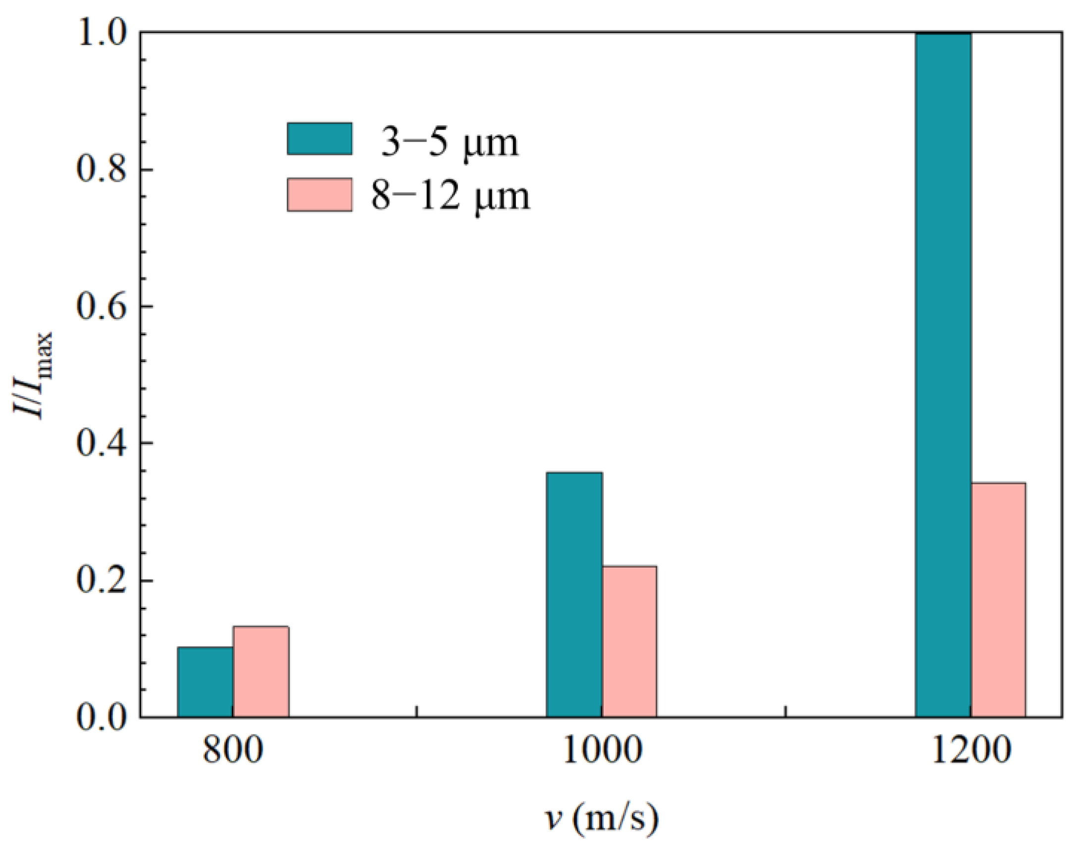 - The increase in the impact velocity enhanced the infrared radiation intensity of the debris cloud. The integrated intensity of the debris cloud at the impact velocity of 1200 m/s was nearly twice that at 1000 m/s.