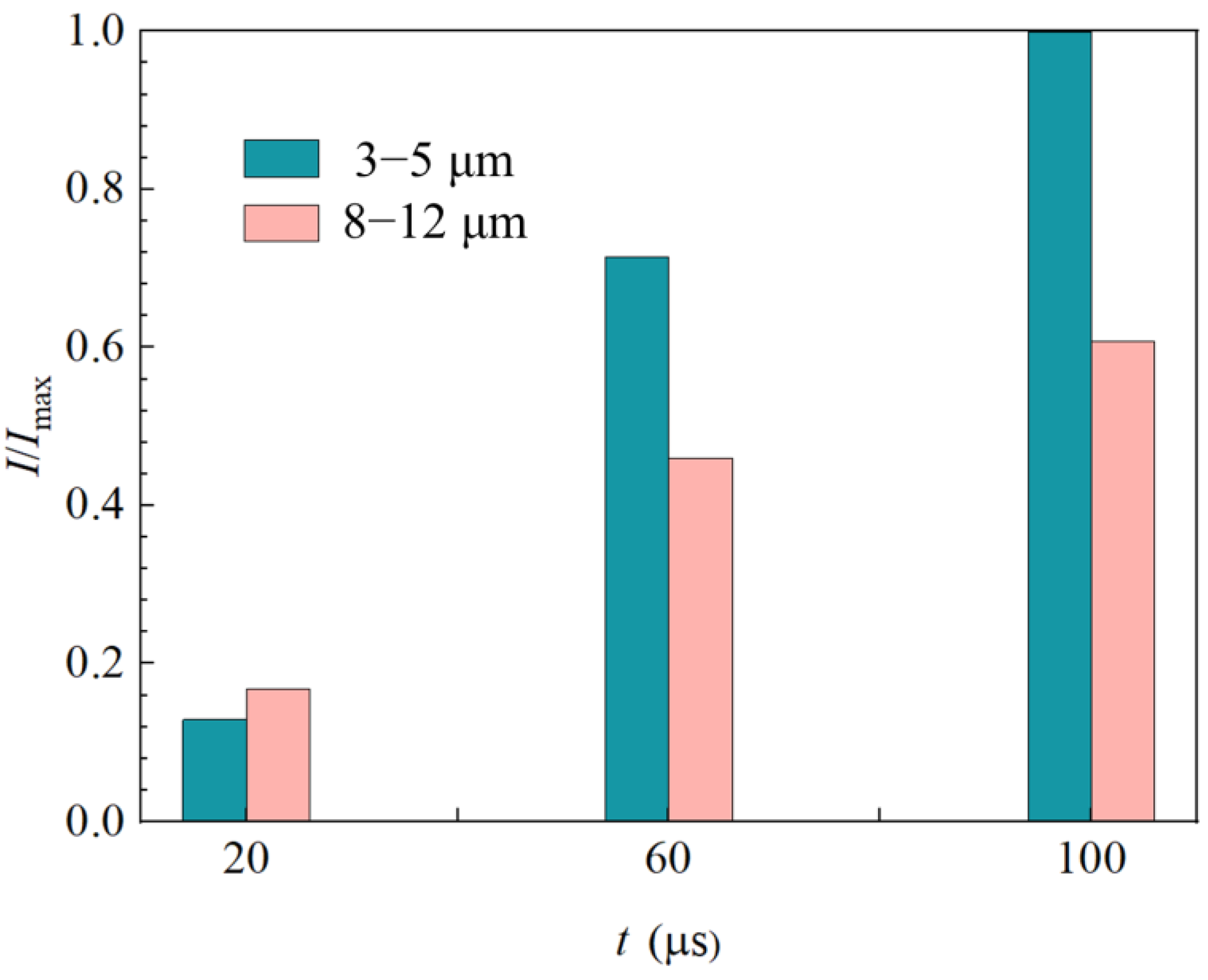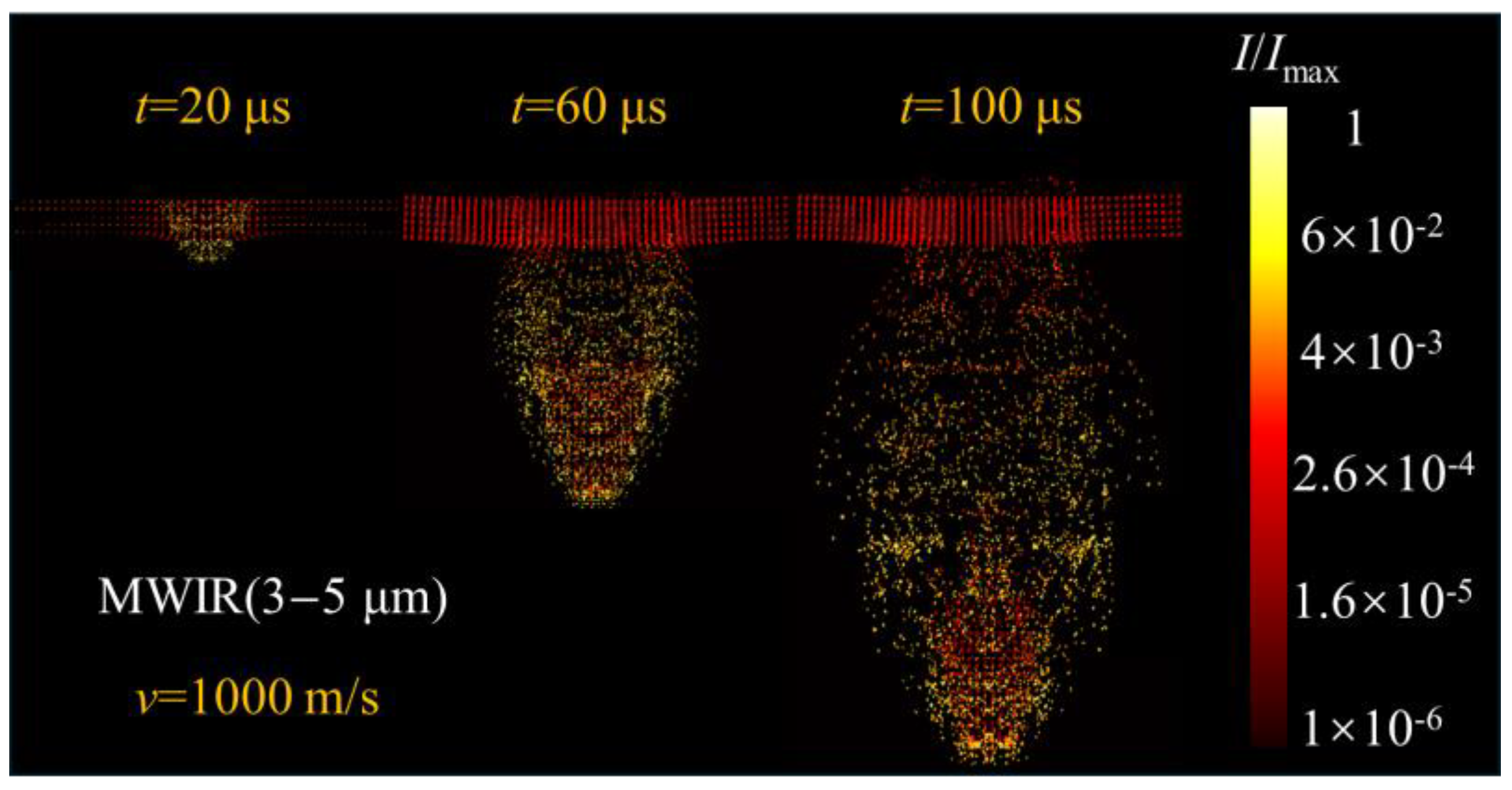 - The MWIR (3–5 μm) infrared radiation intensity of the debris cloud exceeded that of the LWIR (8–12 μm) band, indicating that the MWIR (3–5 μm) was the best band for the detector.