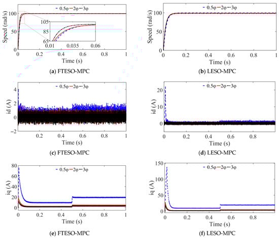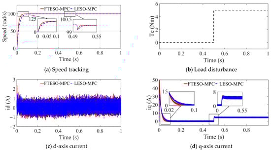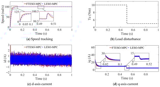 Under the condition of load increase, the dynamic response curves of different control strategies are illustrated in Figure 3. This figure presents the simulated speed response of the proposed FTESO-MPC and the benchmark LESO-MPC controllers when the PMSM is subjected to a sudden external load disturbance. Specifically, Figure 3b depicts the load profile: the PMSM is initially set to track a reference speed of 100 rad/s and starts from no-load conditions. At a specific time instant, an external torque load of 5 N·m is suddenly applied. As shown in Figure 3a, both FTESO-MPC and LESO-MPC demonstrate satisfactory speed tracking performance during the no-load start-up and acceleration phase. However, the FTESO-MPC exhibits superior dynamic performance. In the initial acceleration phase (0~0.1 s), FTESO-MPC responds significantly faster than LESO-MPC, quickly converging to the reference speed with a smaller steady-state error. This indicates that FTESO-MPC possesses enhanced dynamic response characteristics and regulation precision. When the external load is abruptly increased, the LESO-MPC controller shows a larger speed dip and a longer recovery time. In contrast, the FTESO-MPC maintains better disturbance rejection, with less speed fluctuation and faster recovery to steady-state. These results verify that FTESO-MPC achieves more effective compensation against load perturbations, offering improved robustness and faster transient recovery. Such advantages are particularly beneficial for electric drive systems, where precise and rapid adaptation to variable load conditions contributes directly to improved stability and enhanced control reliability.