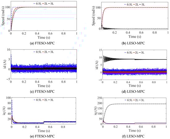 Figure 5 illustrates the dynamic response curves of different control strategies under varying inductance conditions. Specifically, the figure compares the performance of FTESO-MPC and LESO-MPC when system inductance is subject to step changes, with all other load conditions consistent with those in Figure 3b. The purpose of this simulation is to evaluate how well each controller adapts to inductance variations, which are common in practical electric drive systems due to temperature fluctuations, magnetic saturation, or structural uncertainties. As observed in Figure 5a, the FTESO-MPC maintains robust dynamic performance across all inductance scenarios. When the inductance is reduced to 0.5 times its nominal value, the system exhibits fast rise time and minimal overshoot, indicating strong regulation capabilities. With a doubled inductance (2×), the system still achieves smooth convergence toward the target speed without noticeable overshoot, demonstrating good control stability. Even under a more challenging condition of triple inductance (3×), the FTESO-MPC maintains a stable response, with only a moderate increase in settling time and no observable oscillation. These results underscore the controller’s robustness and adaptability to parameter uncertainties, which are crucial in energy-efficient electric drive systems operating under dynamic environments. In contrast, Figure 5b shows that while LESO-MPC performs adequately under small inductance variations (0.5× and 2×), its control performance degrades significantly when inductance increases to 3×. The system exhibits pronounced oscillations during the initial phase and takes considerably longer to stabilize, reflecting poor disturbance rejection and limited adaptability to parameter shifts. This sensitivity to inductance variation highlights the limitations of LESO-MPC in handling system uncertainty, which may compromise both stability and energy efficiency in practical applications. Overall, the comparison confirms that FTESO-MPC offers superior robustness and dynamic adaptability, making it a more suitable solution for high-performance electric drive systems, where varying electrical parameters and external disturbances are prevalent.