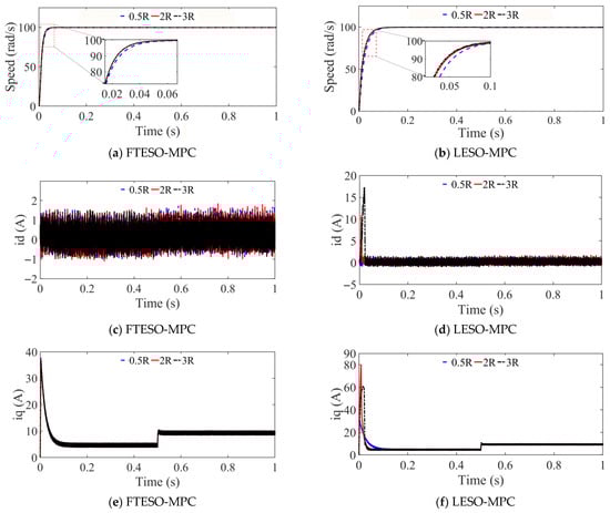 Figure 6 illustrates the simulation results comparing the dynamic responses of FTESO-MPC and LESO-MPC controllers under varying stator resistance conditions. The purpose of this comparison is to assess each controller’s ability to maintain stable system performance in the presence of parameter uncertainty, a critical concern for energy-efficient electric drive systems operating in sustainable transportation environments. The external load conditions are consistent with those specified in Figure 3b. As shown in Figure 6a, during the startup phase (0~0.2 s), both FTESO-MPC and LESO-MPC controllers successfully accelerate the motor from standstill to the reference speed of 100 rad/s. Under nominal resistance, the two controllers exhibit similar transient performance. However, as the resistance increases to 2× and 3× the nominal value, noticeable differences emerge. The FTESO-MPC maintains smooth and responsive tracking behavior with minimal overshoot or oscillation. In contrast, the LESO-MPC shows a slower dynamic adjustment, especially under 3× resistance, indicating reduced adaptability. The superior robustness of FTESO-MPC stems from its use of a finite-time convergent observer, which enables rapid and accurate disturbance estimation. This enhances the control system’s resilience under varying resistive conditions, a feature especially valuable for electric vehicles where operating conditions and thermal environments frequently change. Further validation is presented in Figure 6e,f, which show the corresponding d-axis current responses. The FTESO-MPC demonstrates superior dynamic current regulation, quickly adapting to resistance changes with smaller transient deviations and faster convergence to steady-state values. Conversely, the LESO-MPC exhibits greater current ripple and significant overshoot, particularly under 0.5× and 3× resistance conditions. These findings confirm that FTESO-MPC not only enhances transient current control but also ensures greater system reliability and thermal stability, aligning with the broader goal of improving robust performance in electric drive systems.