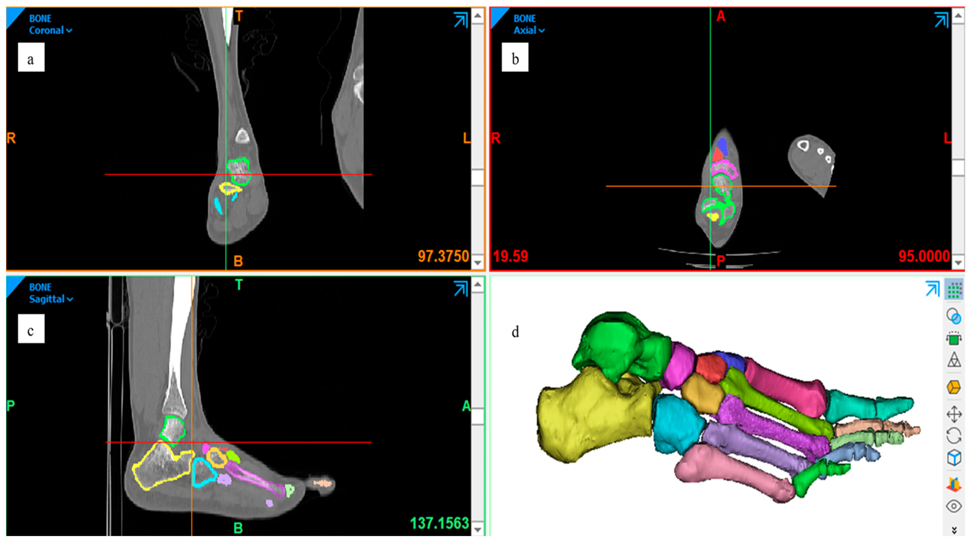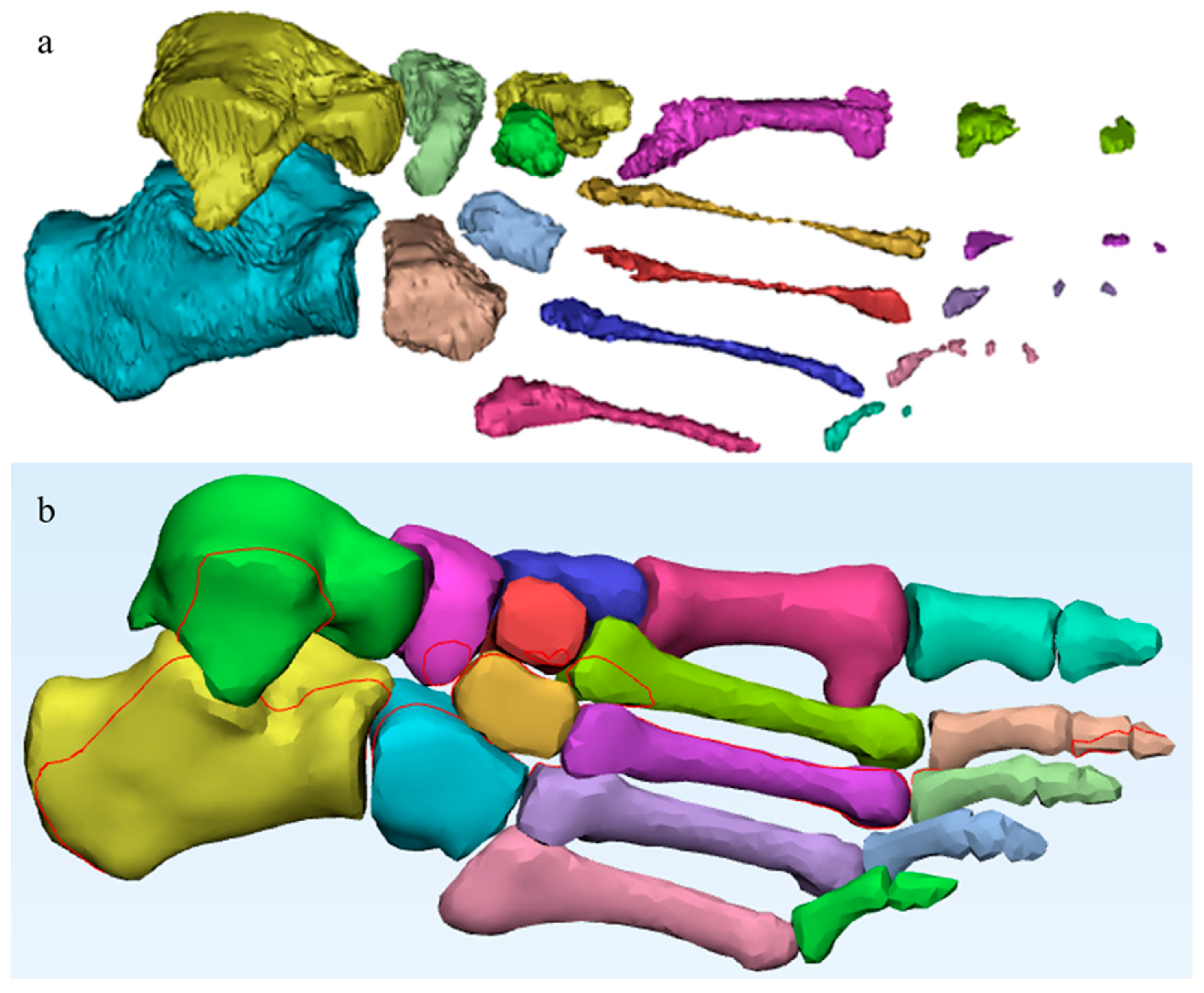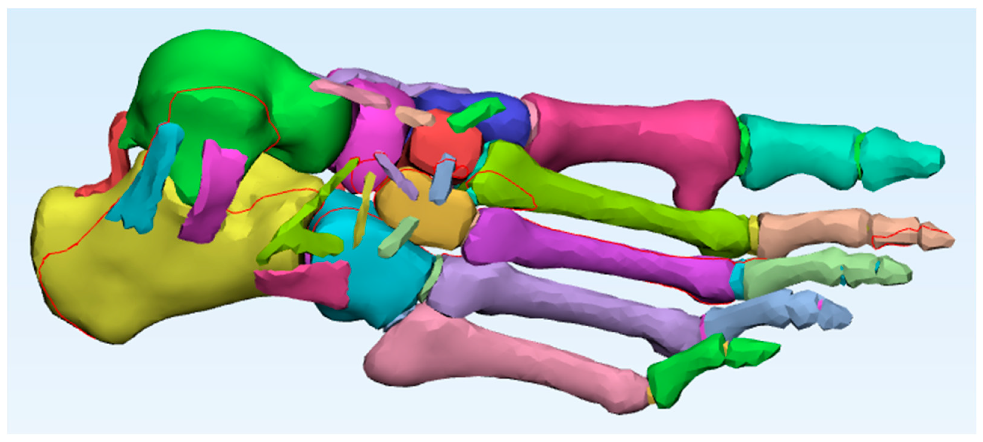 A high-resolution computed tomography (CT) scan of the right foot of a healthy 30-year-old male subject, 1.65 m tall and weighing 63 kg, was used. The images obtained in DICOM format were imported into Mimics software (Materialise), where detailed segmentation of the 26 bones of the foot was performed [