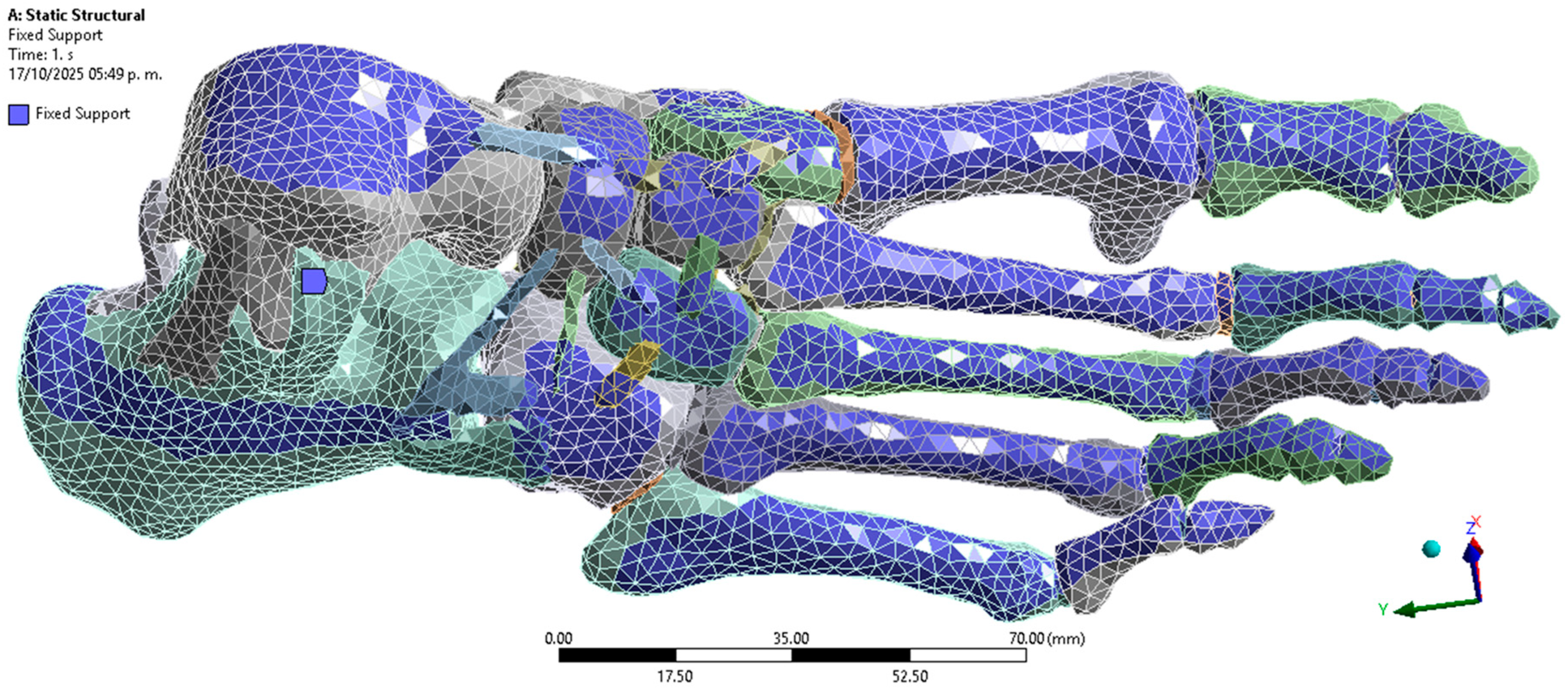 34], boundary constraints were applied as Fixed Supports on the upper surfaces of the foot and around the calcaneus. These constraints simulate the behaviour of the foot during the mid-phase of the athletic gait cycle, when the heel is in firm contact with the ground and most of the body weight is supported [
