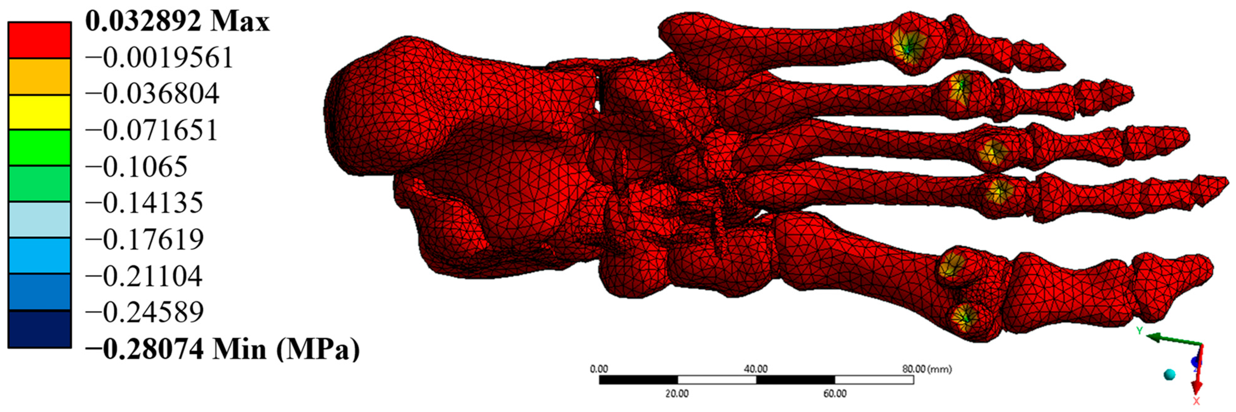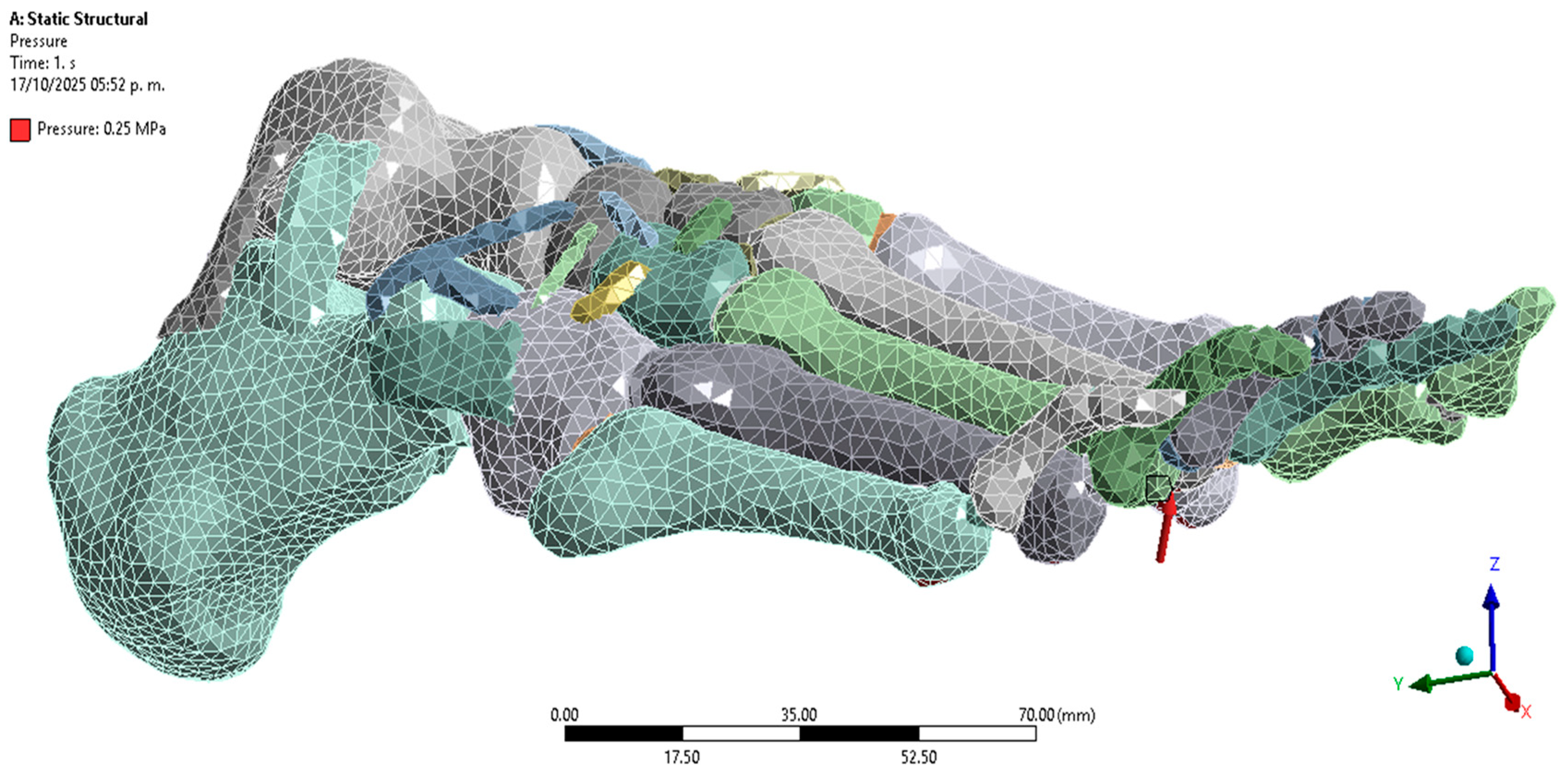 Figure 5). The plantar pressure was not applied as a single concentrated load but as a distributed surface load over the metatarsal heads and phalangeal regions, which correspond to the areas of maximum ground contact during mid-stance [