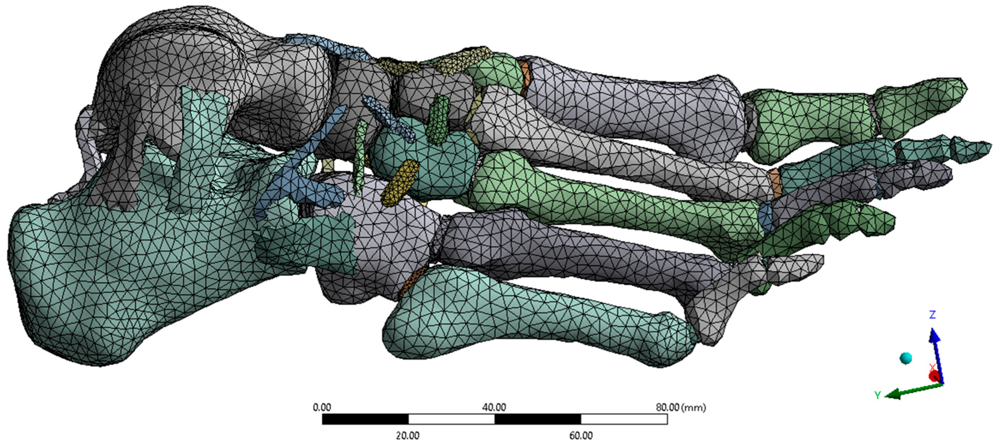 A total of forty-four ligaments were reconstructed to provide realistic joint constraints and anatomical connectivity between the bones of the foot (