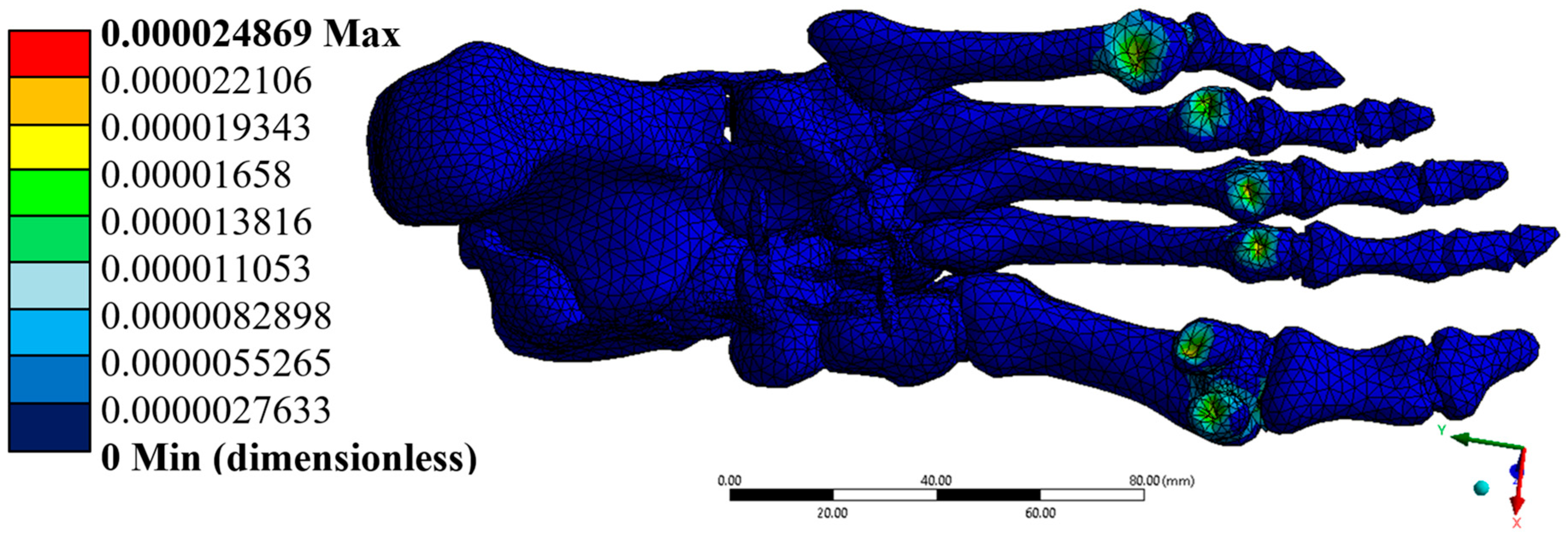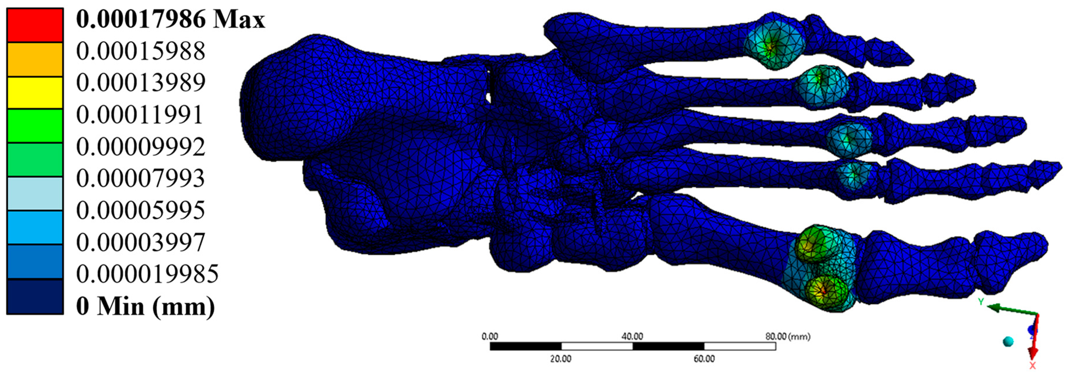 The maximum total displacement was 0.00017986 mm, located primarily in the forefoot region, near the phalanges. This extremely low value indicates a rigid and stable response of the model under the applied load. The displacement components along the x, y, and z axes were also small, with maximum values of 8.16 × 10−5 mm, 4.53 × 10−5 mm, and 1.64 × 10−4 mm, respectively, without compromising the structural integrity of the system. The hindfoot regions, especially the calcaneus, showed zero or negligible displacements, consistent with their anchoring function during the mid-gait cycle.