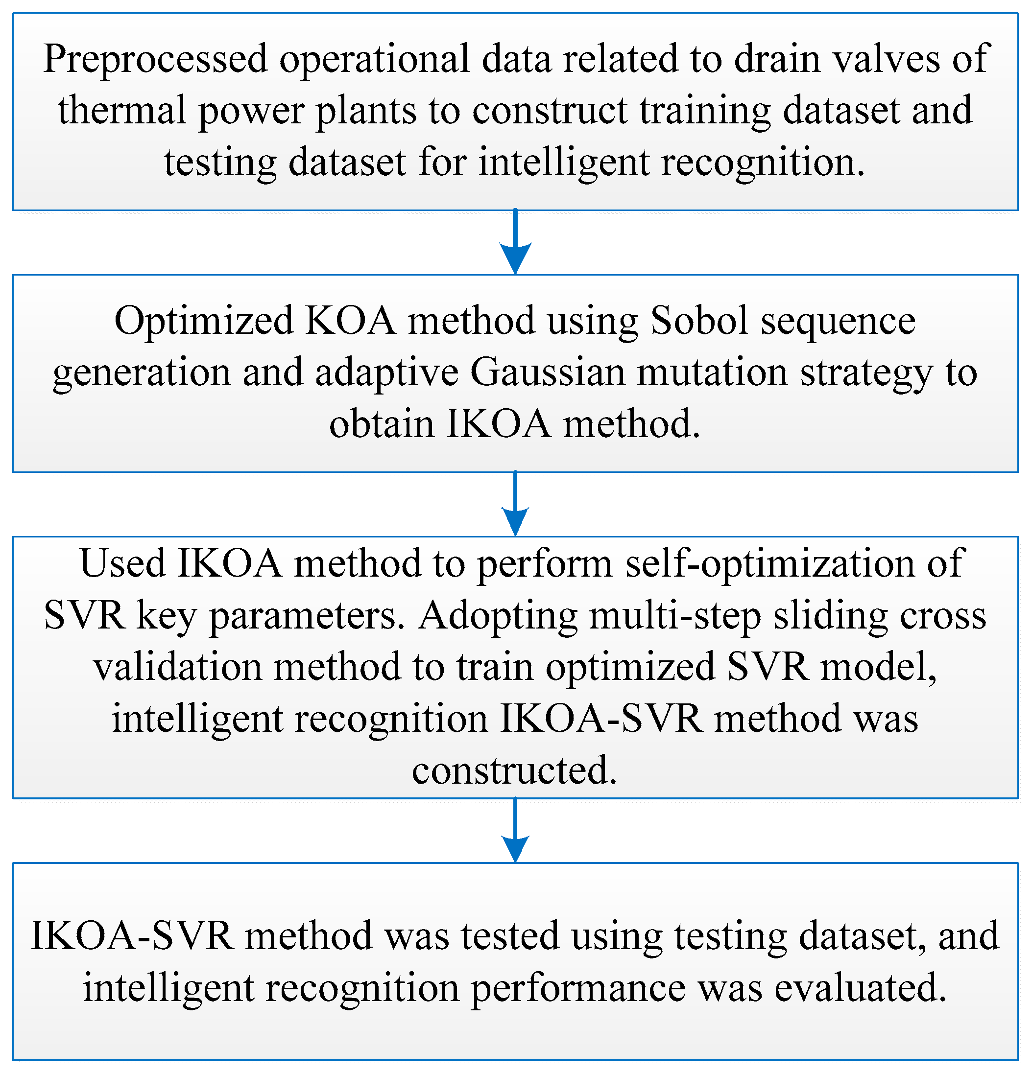 To address the drawback of KOA being prone to falling into local optima, this paper proposed the IKOA method, which combined Sobol sequence generation and an adaptive Gaussian mutation strategy, to achieve intelligent optimization of key parameters in SVR models. The IKOA process was shown in
