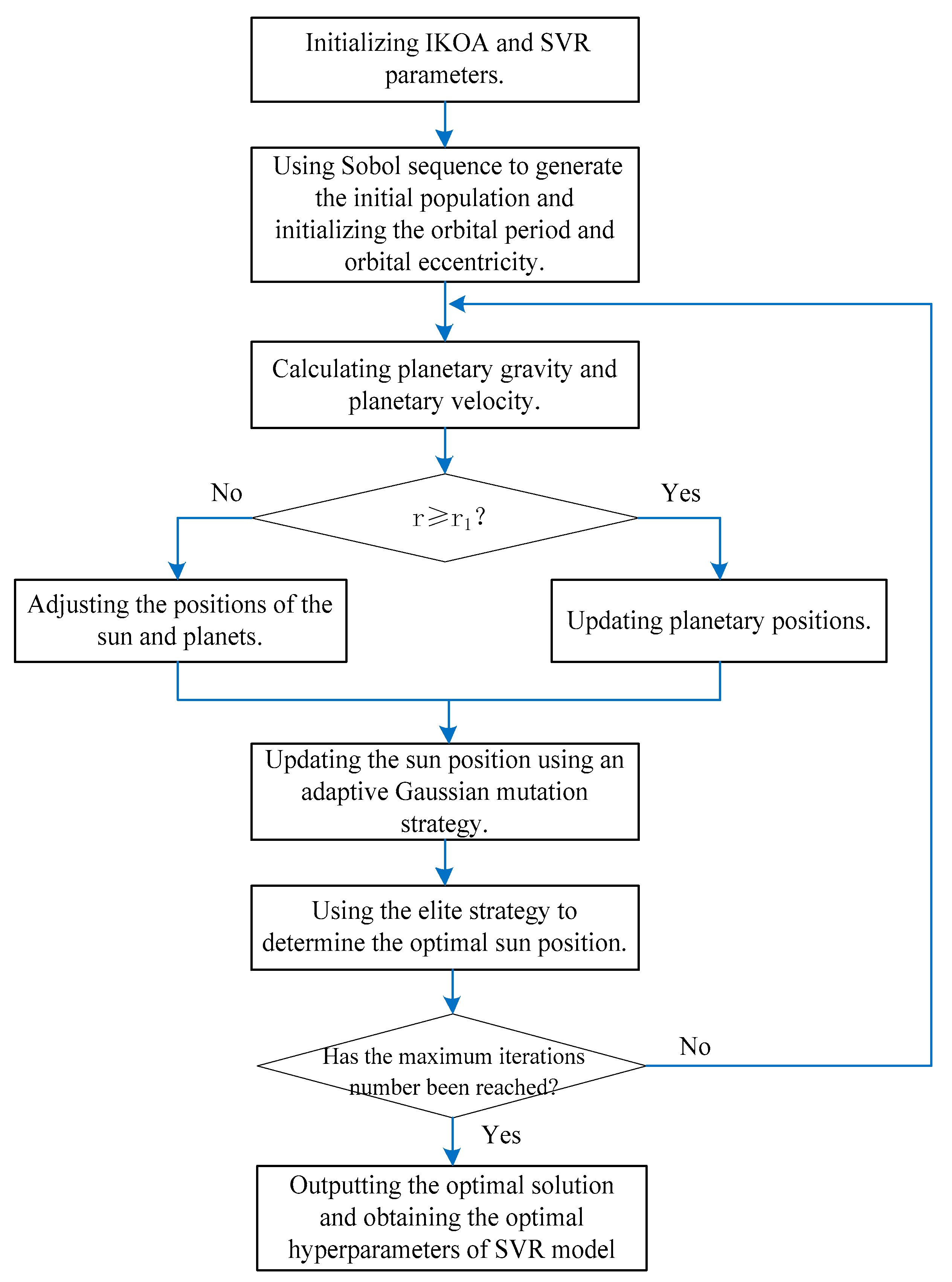 The Sobol sequence was used to generate candidate solutions (planets) within the specified ranges of C and γ. Each planet contains a set of hyperparameters C and γ, forming the initial population. Calculating the fitness of each planet and selecting the planet with the minimum fitness as the Sun, the initial position of the population can be written as