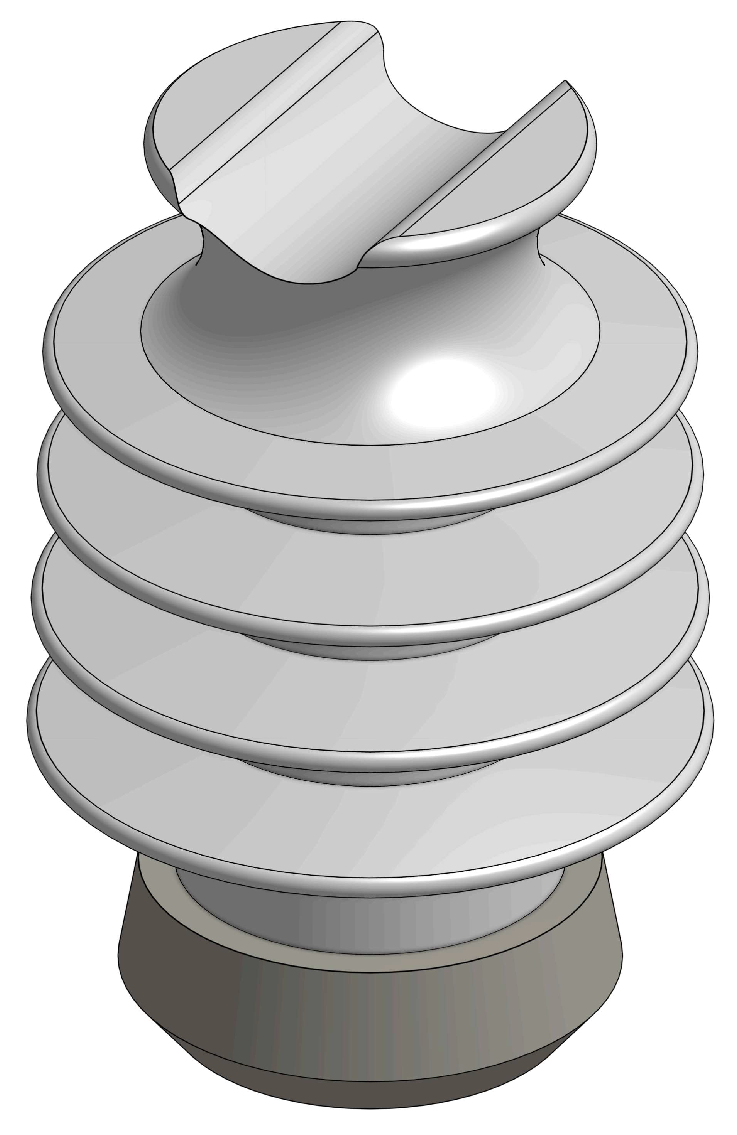 The study considers a 12 kV ceramic insulator of height H = 0.22 m subjected to a short-duration electrical stress in the form of a lightning impulse. The lightning impulse is modeled as an instantaneous temperature rise of Δ T = 100 K applied uniformly over the top surface of the insulator at t = 0 . The 3D model of the insulator is available at [20]. The 3D model is shown in Figure 1.
