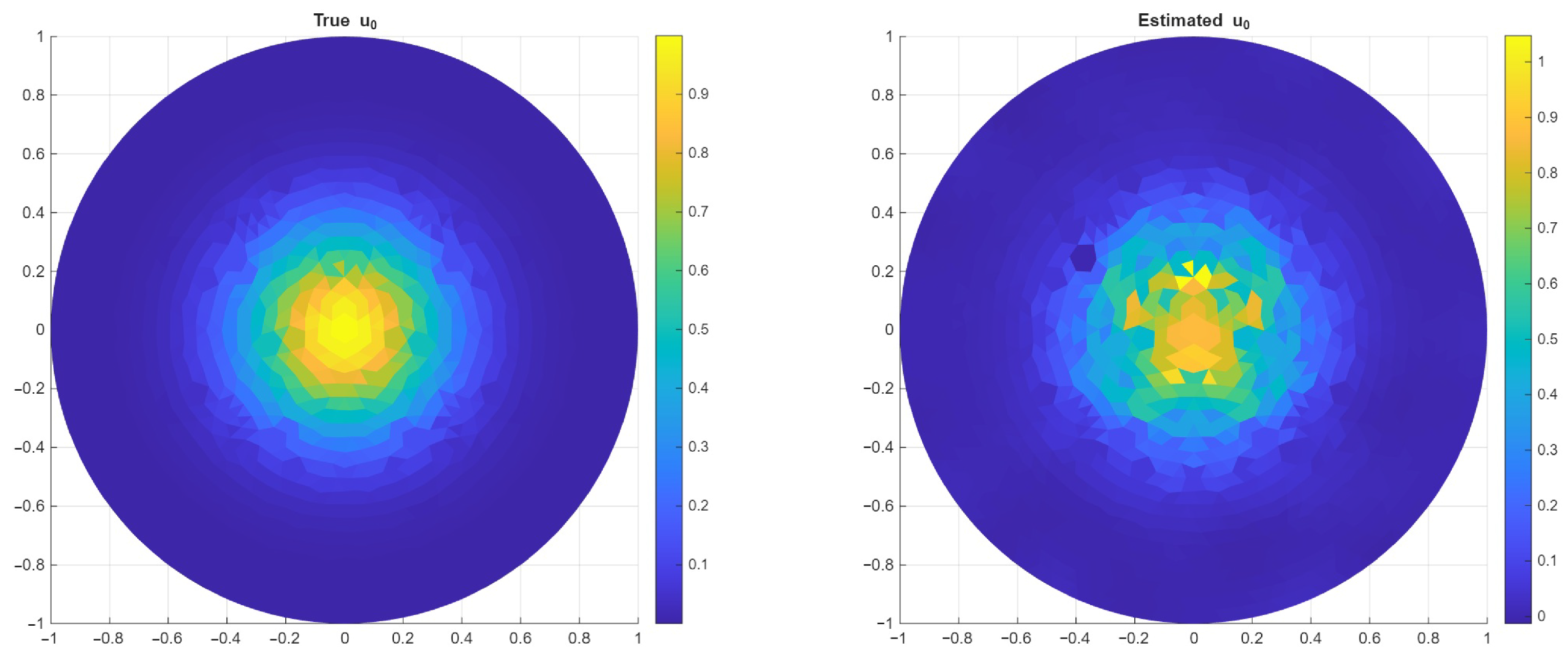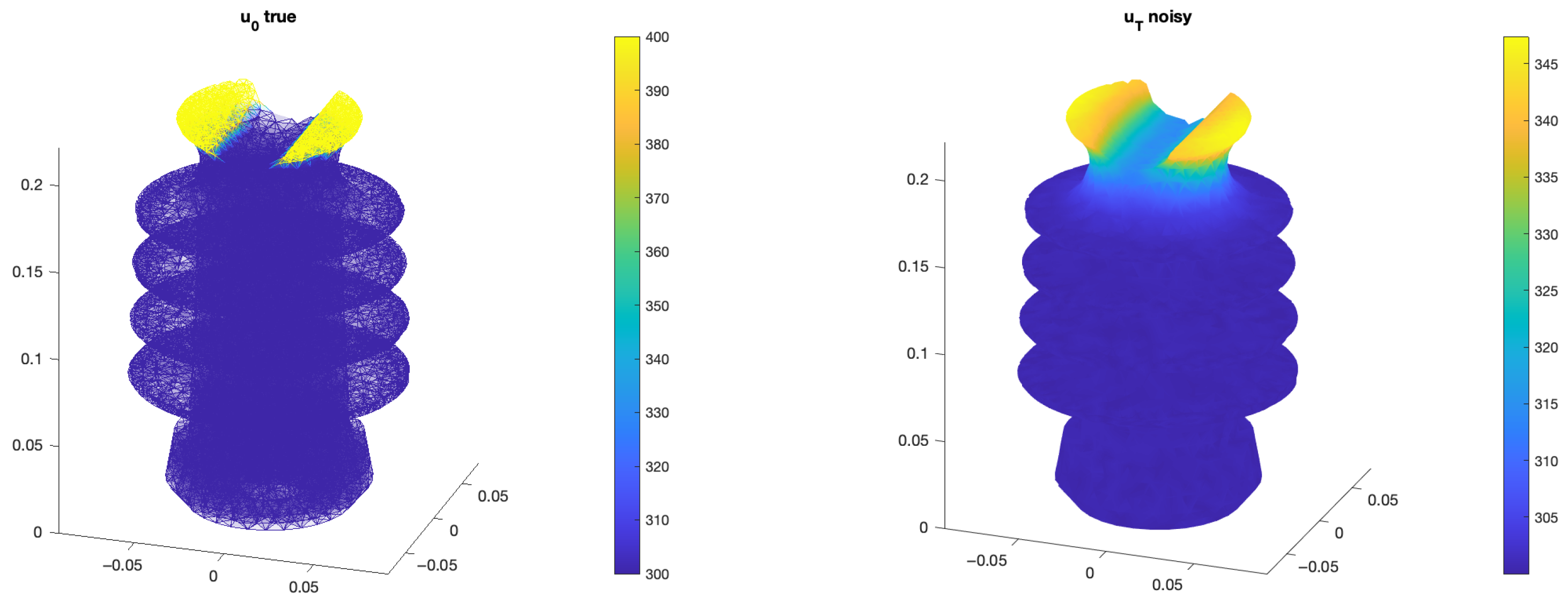 Figure 4. Initial condition of the 10 mm FEM model ( u 0 true) and u T surface measurements at time T = 600 with σ = 1   K ( u T noisy).