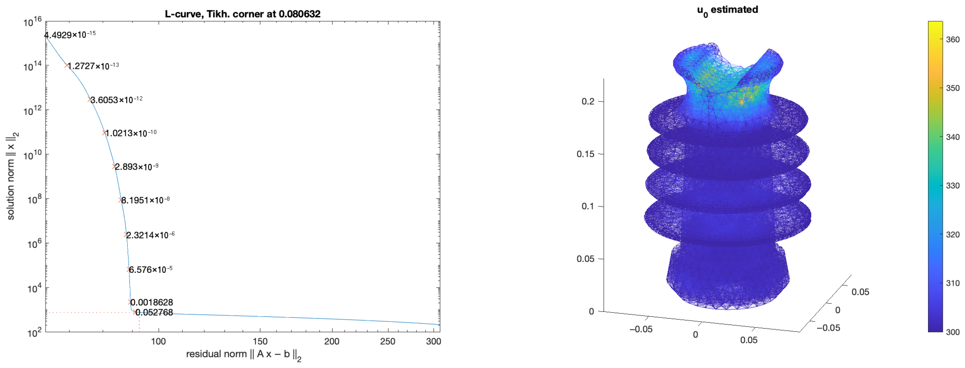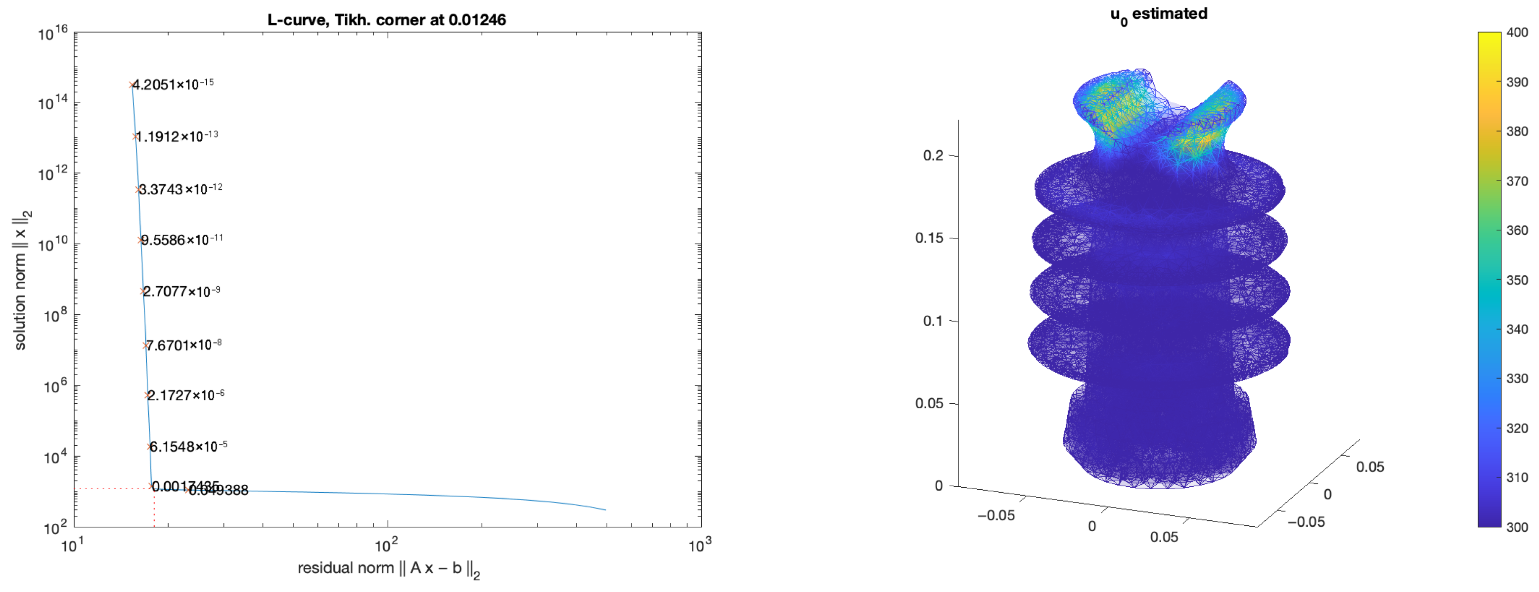 Figure 5. L-curve of the 10 mm model for T = 600 s and the estimated initial condition u 0 estimated of the 10 mm FEM model.
