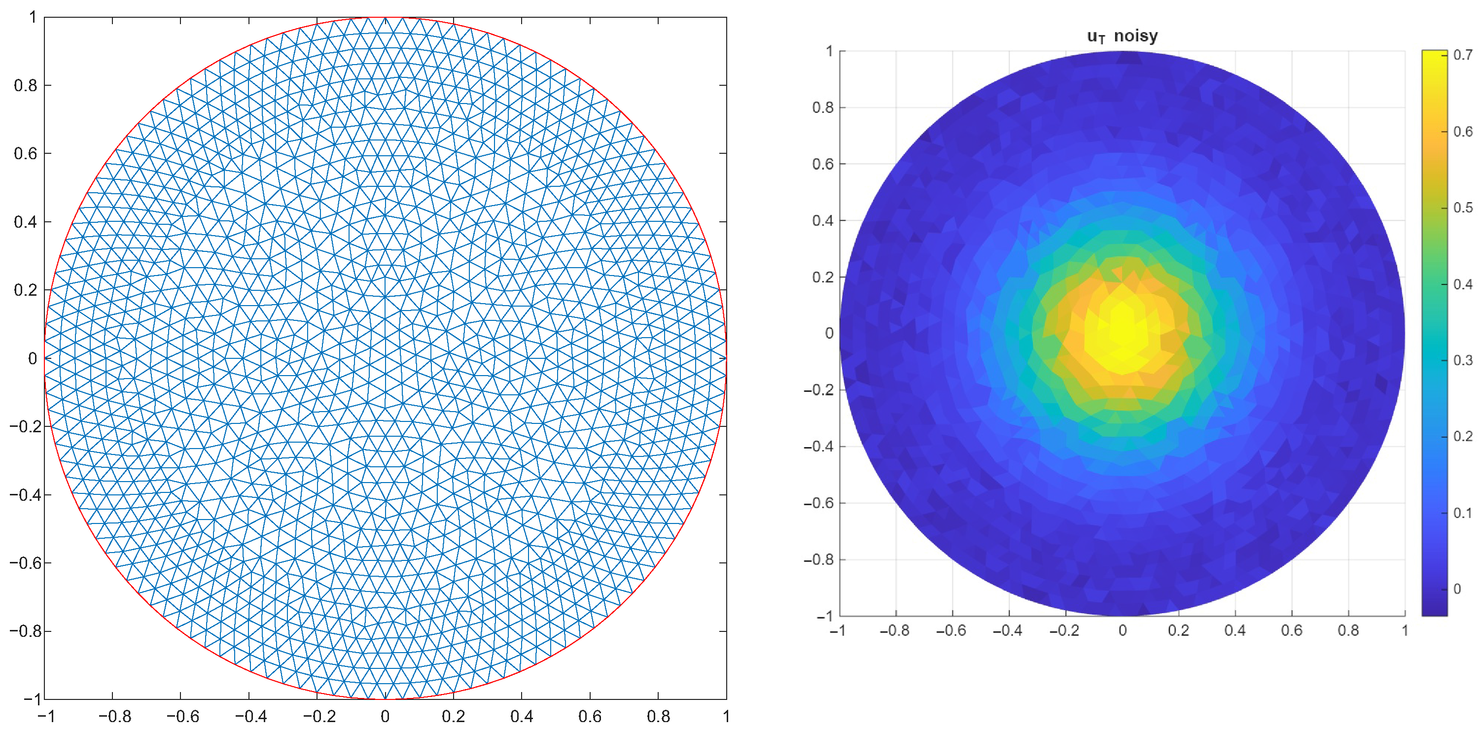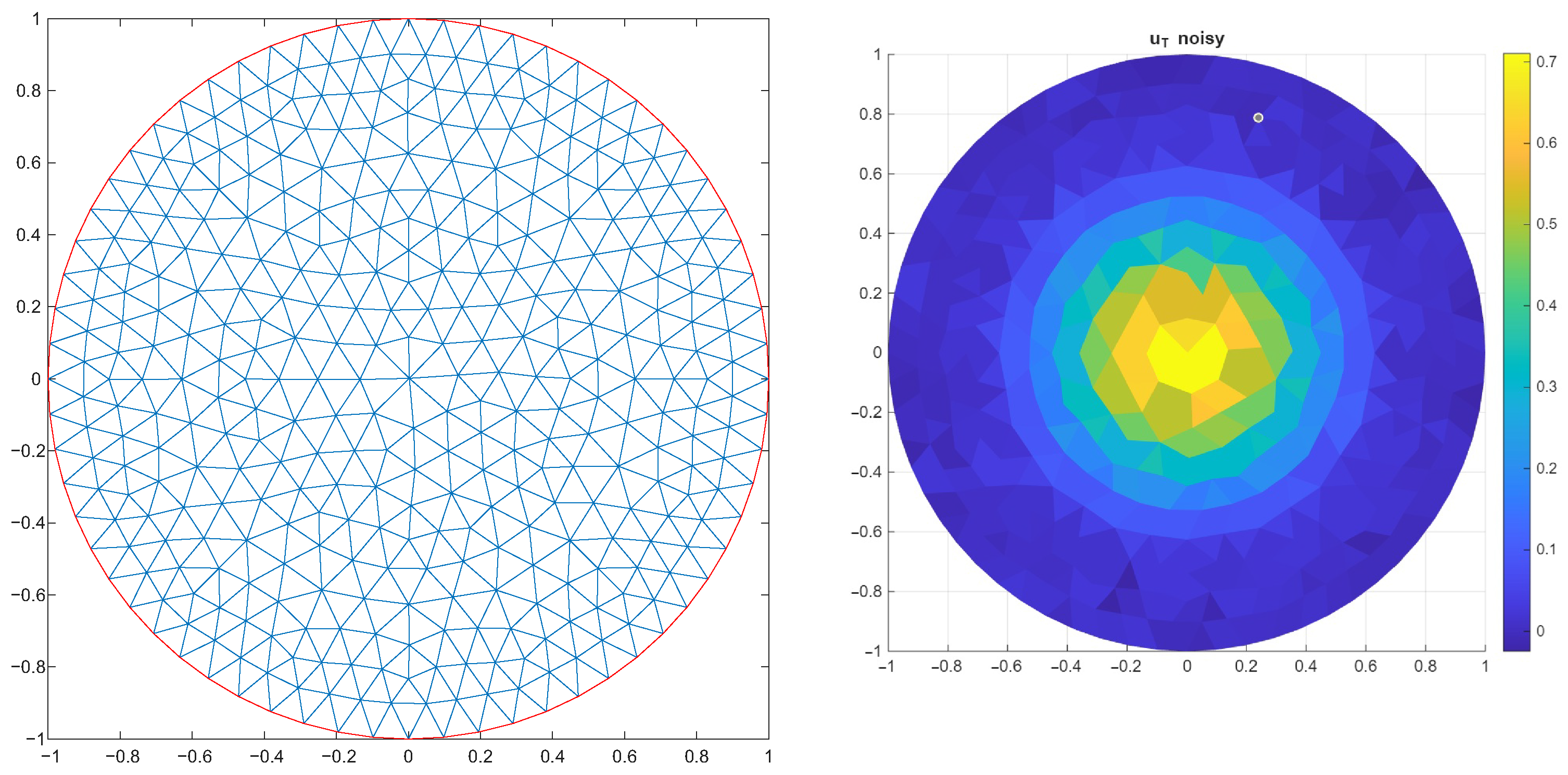 Figure 10. FEM triangulation and noisy measurement u T for h = 0.05 .