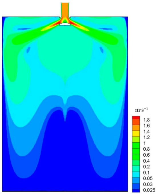 Figure 2 shows the temperature contours of molten steel in the mold. It can be seen that the narrow impact position is 315 mm away from the meniscus. By consulting information and considering parameters such as cross-sectional size and casting speed, it can be considered that the impact depth is relatively reasonable. The shallower the impact depth, the more sufficient nucleation and growth time there is for the initial solidified shell to remelt, which can refine the grain size of the billet and improve its density. The deeper the impact depth, the weaker the ability of inclusions to float up, and it is easy to cause thinning or even steel leakage of the solidified shell. Therefore, when the fluctuation of the mold liquid level can be controlled within a certain range, it is better to have a shallower impact depth of the current flow. Figure 3 is the flow contours of molten steel in the mould. It can be seen that the molten steel flows out of the submerged nozzle at a certain angle and enters the mould in the form of an impact stream, and then impacts the narrow surface. The tendency and order of magnitude of the results are in agreement with the results simulated by Takatani et al. and Li et al. [17,18]; they also agree with the experimental results proposed by Shamsi et al. and Lu et al. [19,20].