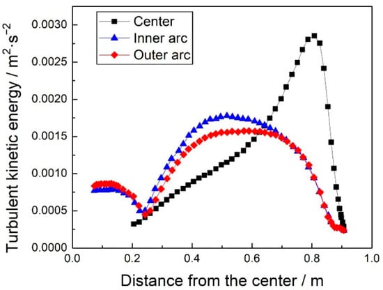 The variation in turbulent kinetic energy near the center of the free liquid surface and the two wide surfaces is shown in Figure 4. When the steel liquid reaches the meniscus in the upper annular flow zone, the velocity component perpendicular to the liquid surface direction reaches a local extreme value, and the horizontal flow velocity parallel to the liquid surface direction is also high, resulting in the highest turbulence kinetic energy of 0.00284 m2∙s−2 at the centerline, 108 mm from the narrow surface. According to the correspondence between turbulence kinetic energy and liquid surface wave height, the peak value of liquid surface wave height is also near this position, consistent with the results in Figure 2. Under the intense cooling effect of the copper plate, the viscosity of the steel liquid in the boundary area of the inner and outer arcs of the mold rapidly increases with the decrease in temperature. At the same time, due to the blocking effect of the initial shell and paste zone on the flow, the flow rate and kinetic energy gradually decrease. The maximum turbulent kinetic energy values near the inner and outer arcs are significantly lower than the centerline. At 1/4 width of the billet, the turbulent kinetic energy of the molten steel near the mold wall reaches its highest value, with the maximum values of the turbulent kinetic energy of the inner and outer arcs being 0.00166 m2∙s−2 and 0.00144 m2∙s−2, respectively. Based on the calculation results, in the area from the narrow surface to 1/4 of the width of the casting billet, the turbulent kinetic energy of the center line and the near inner and outer arc copper plate steel liquid is relatively high, and the fluctuation of the liquid level and the inflow of slag are easily disturbed. It is a high-incidence area for longitudinal cracking and bonding of the casting billet, and attention should be paid to it in the design of the nozzle and flow field optimization.