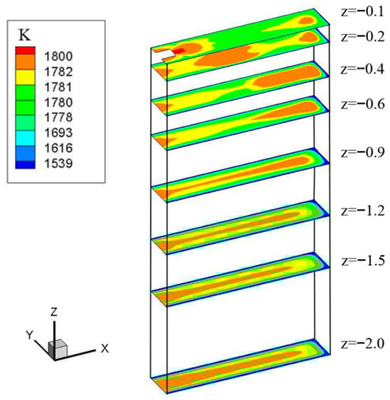 The distribution of steel liquid temperature at different heights is shown in Figure 5. Under the cooling effect of the mold, the temperature of the molten steel gradually decreases along the casting direction, and the temperature at the corners of the billet decreases more significantly. The temperature of the molten steel on the path of the two splitting strands located in the upper and lower circulation zones is relatively high, above 1781 K. The temperature range from the center of the billet to the narrow 1/4 section, which is enclosed by the upper annular flow zone and 400 mm below the liquid level, is relatively low and lower than the liquidus temperature. After the billet is removed from the mold, the influence of nozzle injection and upper and lower circulation flow on the symmetry of section temperature distribution gradually weakens. Below 1.5 m from the liquid level, the temperature distribution is roughly symmetrical along the centerline, and the changes in the wide direction are relatively gentle. Heat transfer and solidification are basically no longer affected by the flow of molten steel.