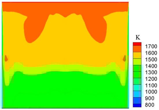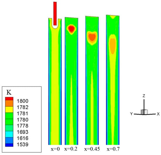 Figure 6 shows the distribution of steel liquid temperature along different longitudinal sections of the slab width direction. From the figure, it can be seen that the temperature field distribution of the molten steel is consistent with the flow field results. The higher temperature molten steel flows out of the nozzle and moves towards the narrow surface of the casting billet. The corresponding high-temperature area can be seen from the temperature distribution diagram of the longitudinal section of the casting billet. Overall, the temperature near the meniscus at the center of the longitudinal section is high and gradually decreases outward and downward. When the temperature drops to the solidus, the liquid steel begins to solidify and forms a solidified shell.