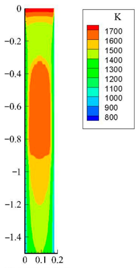 - The temperature of the steel liquid on the path of the two splitting strands located in the upper and lower circulation zones was relatively high, above 1781 K. The temperature range from the center of the billet to the narrow 1/4 section, which was enclosed by the upper annular flow zone and 400 mm below the liquid level, was relatively low and lower than the liquidus temperature.