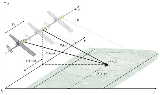 Upon reaching the ground surface, signal (1) is reflected from each point, taking into account the complex reflection coefficient at that location. The surface-scattered signals are received by the observation area mounted on the aerospace platform, following the geometry shown in Figure 1. It is assumed that the aircraft is flying in a straight line along the axis , at a fixed altitude and a constant velocity .