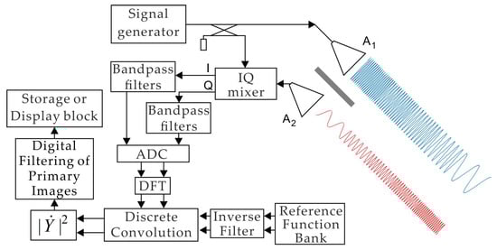 Based on the derived optimal operations (18) and (22)–(24), the main functional components of the radar system for terrain imaging using continuous LFM signals are established. The structural diagram of the system is shown in Figure 4.