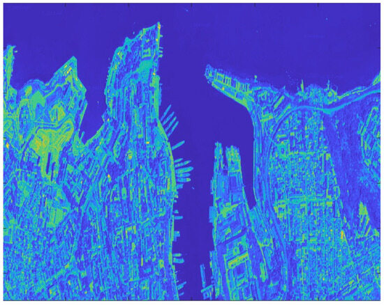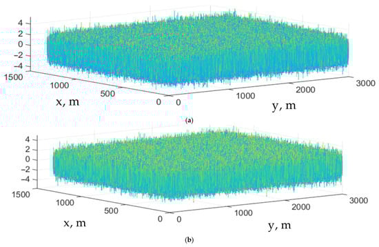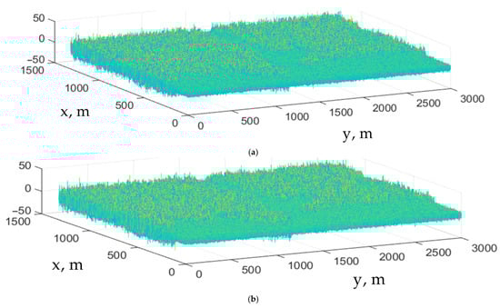 Figure 5 illustrates the variance distribution representing the true incoherent radar image. Based on model (34), Figure 6 shows the random components and . Figure 7 displays the distribution of the complex reflection coefficient ( and ) over the surface.