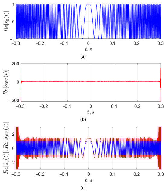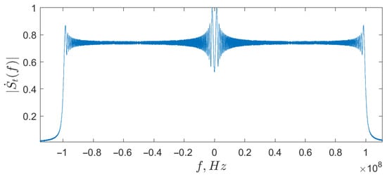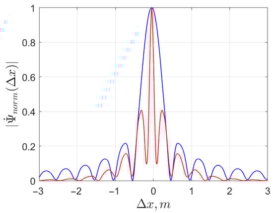 Let us examine the arguments of some functions included in Equation (21). Suppose that the aircraft’s flight altitude is 1500 m and the maximum viewing angle from nadir is 45°. Then the maximum range and delay time are and . The maximum coordinate deviation is determined by the half the width of the radiation pattern in the azimuthal direction. To calculate it we suppose that the length of the antenna is 30 cm, the RF input frequency is 10 GHz, the frequency deviation of the LFM-CW signal is 100 MHz, and . Then the maximum coordinate deviation is 106 m. The maximum signal delay time is . The maximum observation time is determined by the width of the illuminated spot on the surface in the azimuthal direction and the speed of the aircraft, . At a travel speed of 90 km/h, the maximum observation time is approximately . Based on these values, simulation modeling of the functions and was carried out, and the results are shown in Figure 2.