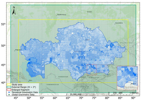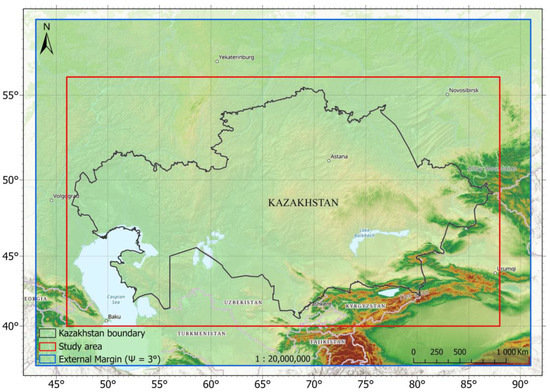 The territory of Kazakhstan extends approximately from 40° N to 56° N in latitude and from 46° E to 88° E in longitude. However, to minimize edge effects during geoid modelling for the main focus area, the computation region was extended beyond the national boundaries, covering the approximate range from 38° N to 58° N in latitude and from 44° E to 90° E in longitude. This expanded area ensures that boundary effects are properly accounted for, allowing for a more accurate representation of the geoid across Kazakhstan’s complex and varied terrain [29].