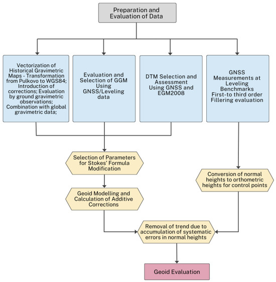 The geoid modelling methodology adopted in this study integrates multi-source gravimetric data and advanced computational techniques to achieve high precision, particularly in areas with complex topography. Figure 2 illustrates the structured workflow for geoid determination and evaluation using a hybrid approach that combines global gravity models with regional terrestrial data. We used the Least -Squares Modification of Stokes’ formula to optimally integrate diverse datasets, ensuring a robust and accurate geoid determination. The process begins with the digitization of historical gravimetric maps, including datum transformation from Pulkovo to WGS84, application of systematic corrections, validation against terrestrial gravity observations, and integration with global datasets. The systematic corrections comprised the transition from the normal Helmert formula to GRS80, the exclusion of the Honkasalo correction and of the Potsdam system correction, and other corrections, as detailed in the study [30]. GNSS/levelling data at first- to third-order levelling benchmarks are employed for input data evaluation, optimization of Stokes’ kernel modification parameters, and final model validation. Normal heights of control points are converted to orthometric heights. The optimal GGM and digital terrain model are selected based on statistical consistency with GNSS/levelling data.