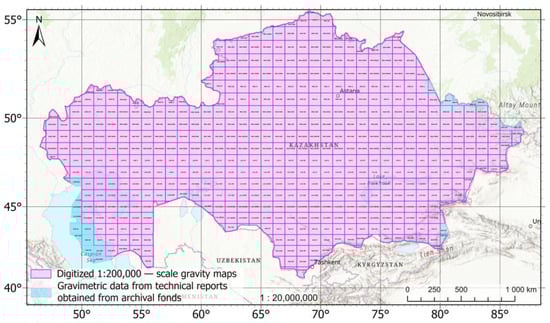 In this study, the core dataset consists of digitized Soviet-era gravimetric maps at a scale of 1:200,000, providing dense coverage for approximately 90% of Kazakhstan (Figure 3). The remaining 10%—primarily the Kazakhstan sector of the Caspian Sea and selected transboundary areas—was completed using gravity materials extracted from archival technical reports [32,33,34]. The maps were originally compiled from ground-based gravity surveys conducted primarily with SN-3, GAK, and GR-2K gravimeters, which were widely used during that period for regional-scale geodetic campaigns. For standardization, the gravity observations were reduced to Bouguer anomalies using intermediate crustal densities of 2.30 g/cm3 or 2.67 g/cm3, accompanied by records of free-air anomalies, terrain corrections, and observation heights [35]. This systematic framework provided a consistent baseline for the construction of Kazakhstan’s first digital gravity database.