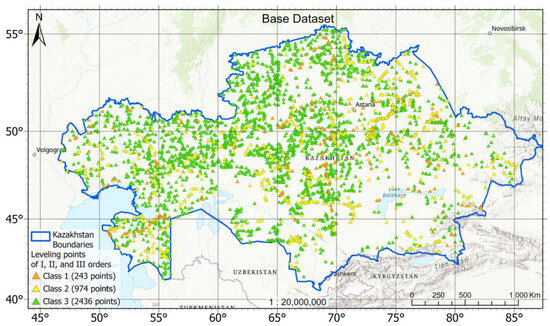 A dataset of 3653 GNSS/levelling points, evenly distributed across Kazakhstan (Figure 5), was selected as the primary reference for the validation of all datasets used in this study. These control points were established under the National Spatial Data Infrastructure (NSDI) project, which led to the creation of the official national reference frame QazTRF-23, replacing the outdated SK-42 system with an ITRF-consistent framework [31].