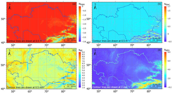 Corrections to approximate geoid heights using (a) topographic correction, m. (b) correction for analytical downward continuation, m. (c) ellipsoidal correction, mm. (d) atmospheric correction, mm.