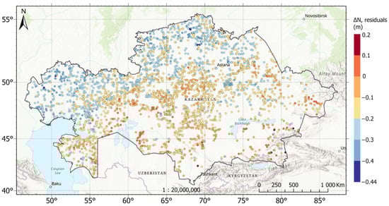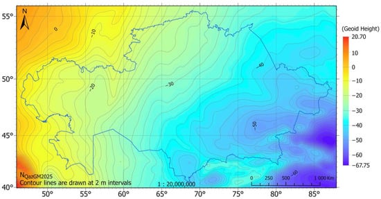 Furthermore, the computed geoid surface of Kazakhstan has been presented at a resolution of 5′ × 5′, highlighting the major spatial patterns (Figure 7). The model captures the expected correlation between geoid undulations and large-scale tectonic and topographic structures, providing a realistic representation of the regional gravity field. The final geoid surface serves as the foundation for subsequent accuracy assessment and validation against GNSS/levelling benchmarks.