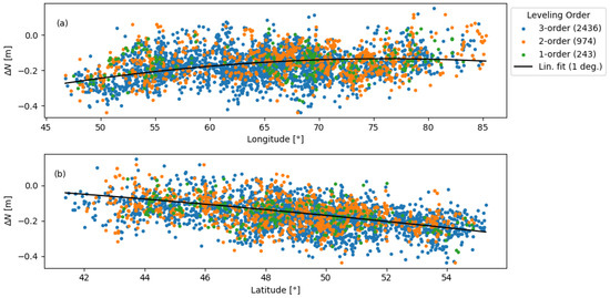 The scatter of the points selected in this way revealed that the variations in the differences ΔN exhibit a pronounced shift and a slope from northwest to southeast, indicating the accumulation of systematic errors in the data. To approximate this constant trend, we employed a linear model dependent on latitude and longitude coordinates. The model coefficients were determined using linear regression, which, for a spherical surface, takes the form: