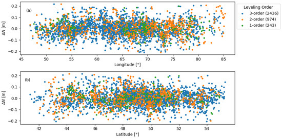 Importantly, the analysis showed no clear accuracy advantage for first-order benchmarks compared to second- and third-order sites. The dispersion of residuals within each order was similar, indicating that the QazGM2025 model achieves a consistent level of accuracy across the heterogeneous national levelling network. This robust validation process, leveraging a comprehensive dataset of GNSS/levelling benchmarks, underscores the high precision and reliability of the QazGM2025 model in representing the regional geoid for Kazakhstan.