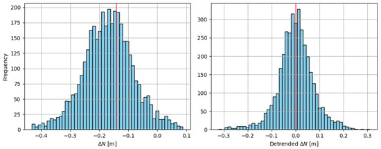 Spatial trends of the residuals are illustrated in Figure 8 (with respect to longitude (a) and latitude (b)), and their geographical distribution in Figure 9. The distribution of corrected residuals is presented in Figure 10. The histograms in Figure 11 illustrate that, after correction, the residuals closely follow a normal distribution centred near zero, confirming the absence of systematic bias.