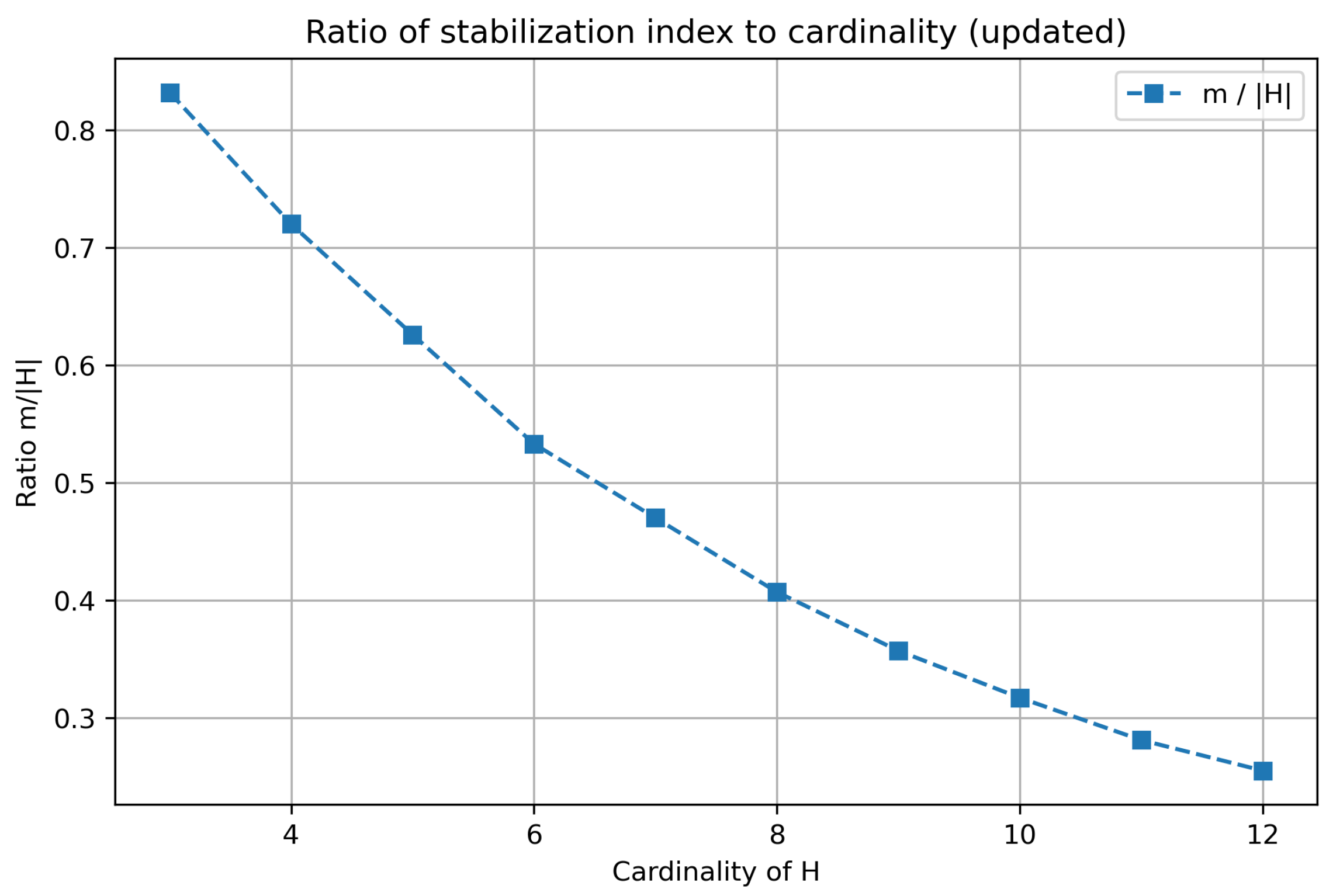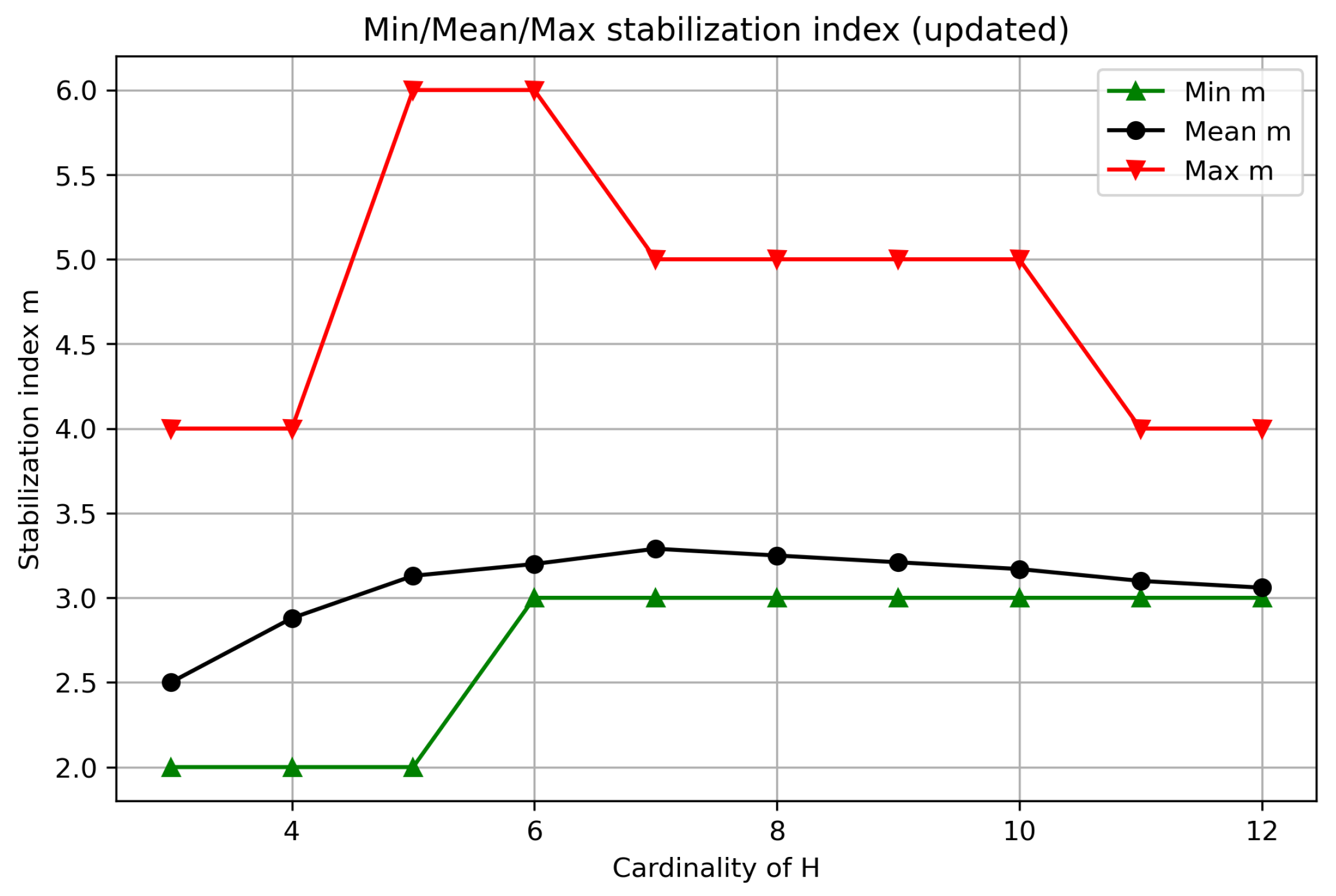 - Standard deviations decrease slightly as cardinality increases, indicating that larger random hypergroupoids tend to have even more consistent stabilization indices.