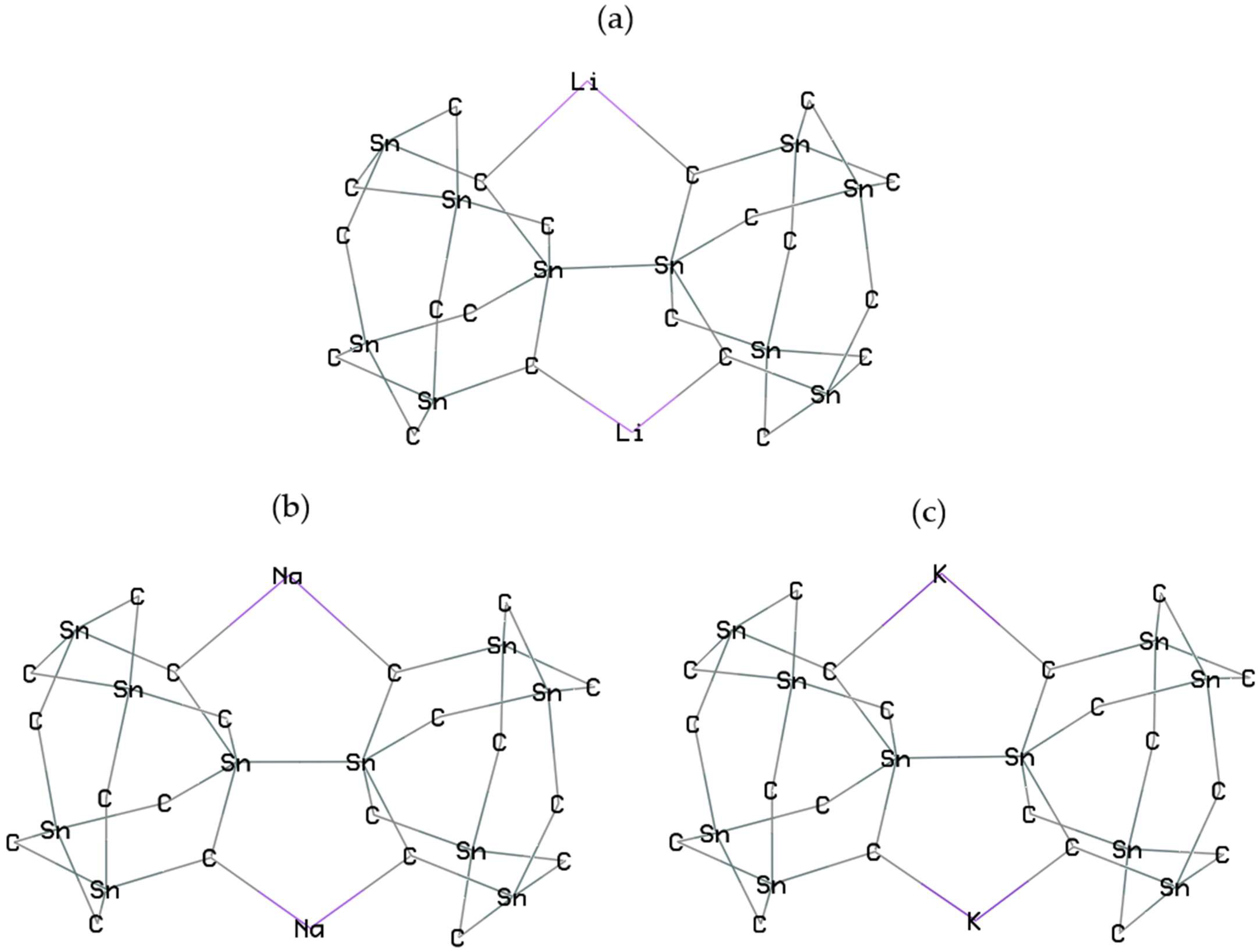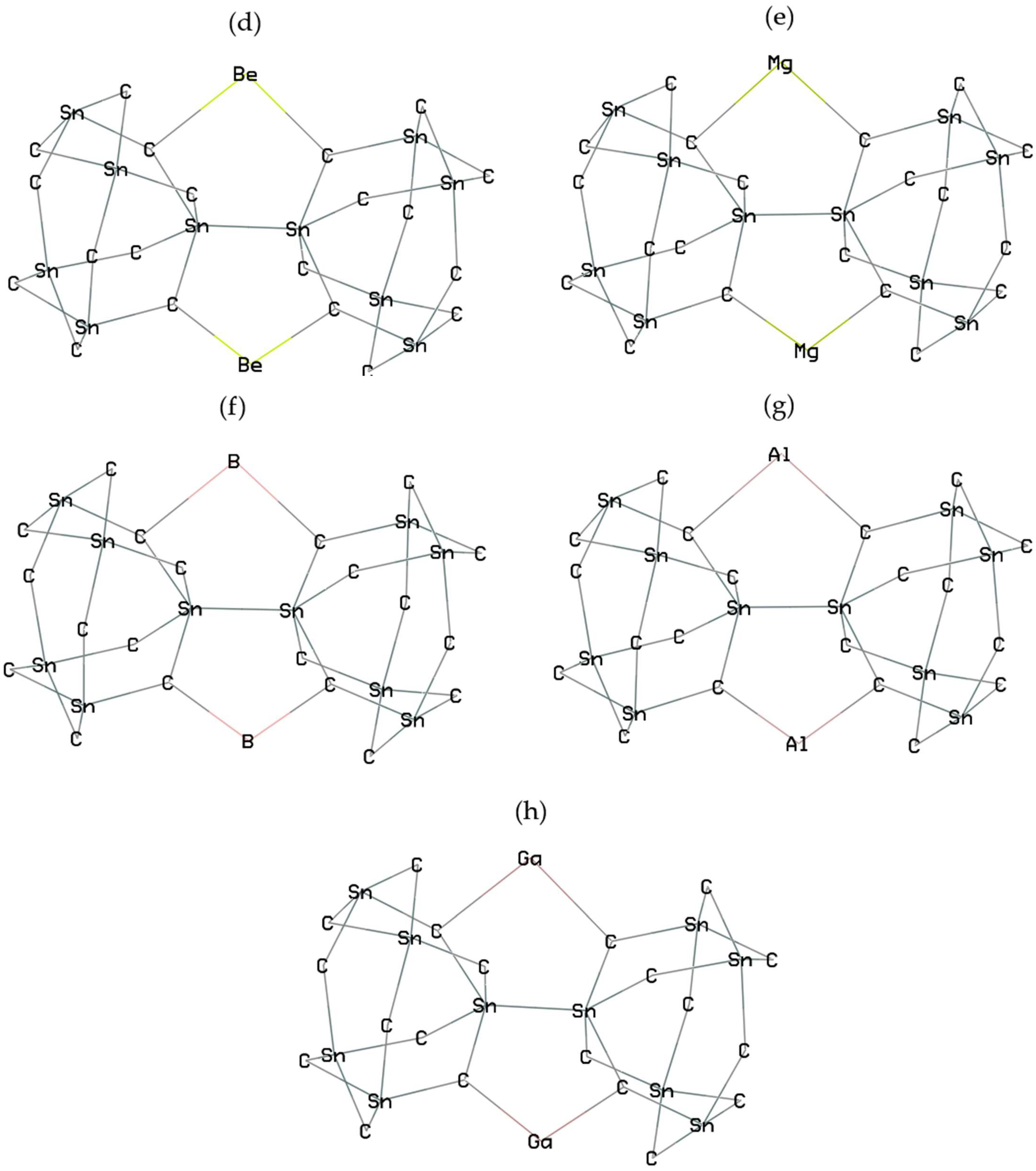Calculations with spin polarization were performed within density functional theory (DFT) [29]. Figure 1a–h shows Groups 1,2,13 metals-based nanoclusters of SiLiC, SiNaC, SiKC, SiBeC, SiMgC, SiBC, SiAlC and SiGaC with the metal capacity number for Li, Na, K (+1), Be, Mg (+2), and B, Al, Ga (+3).
