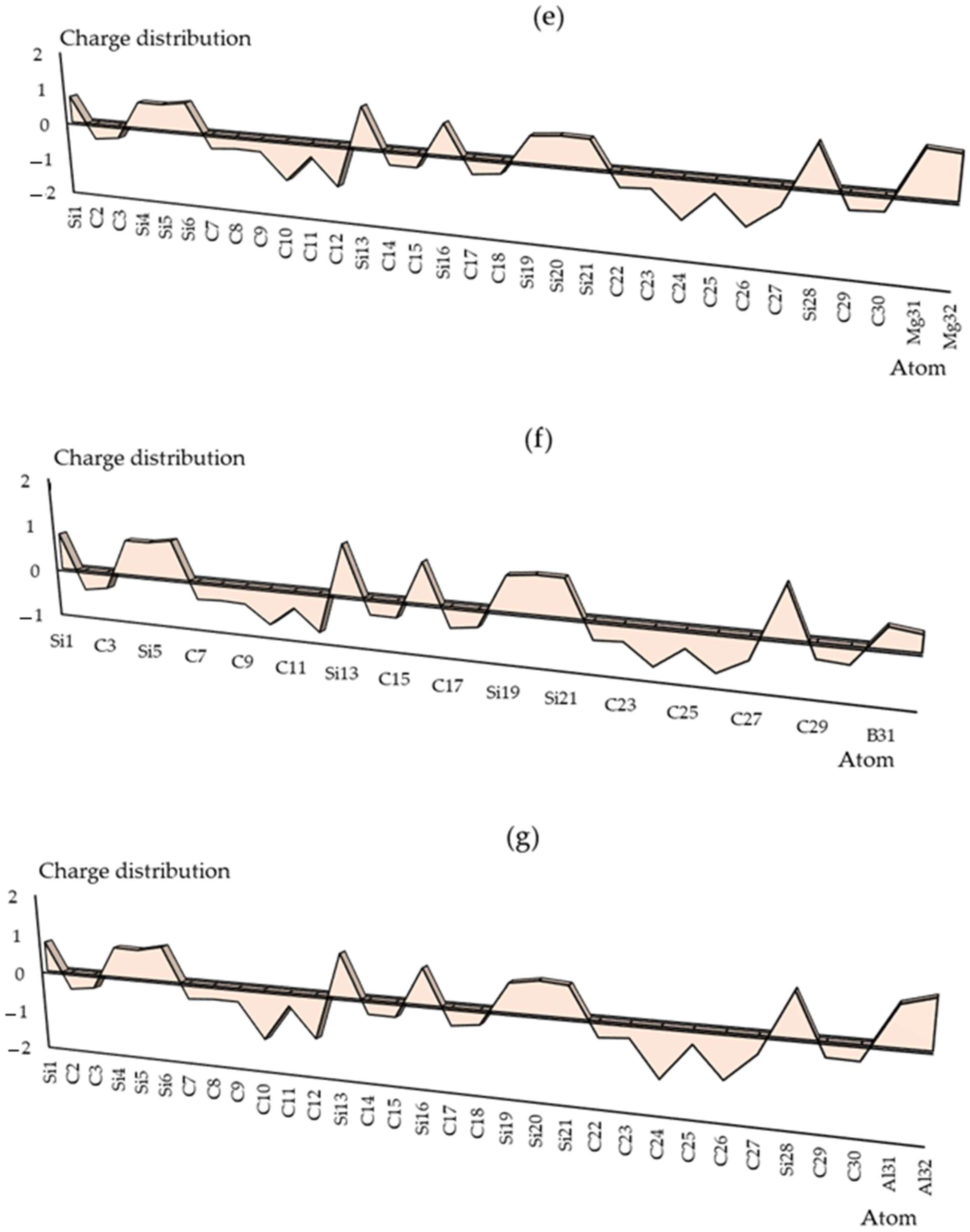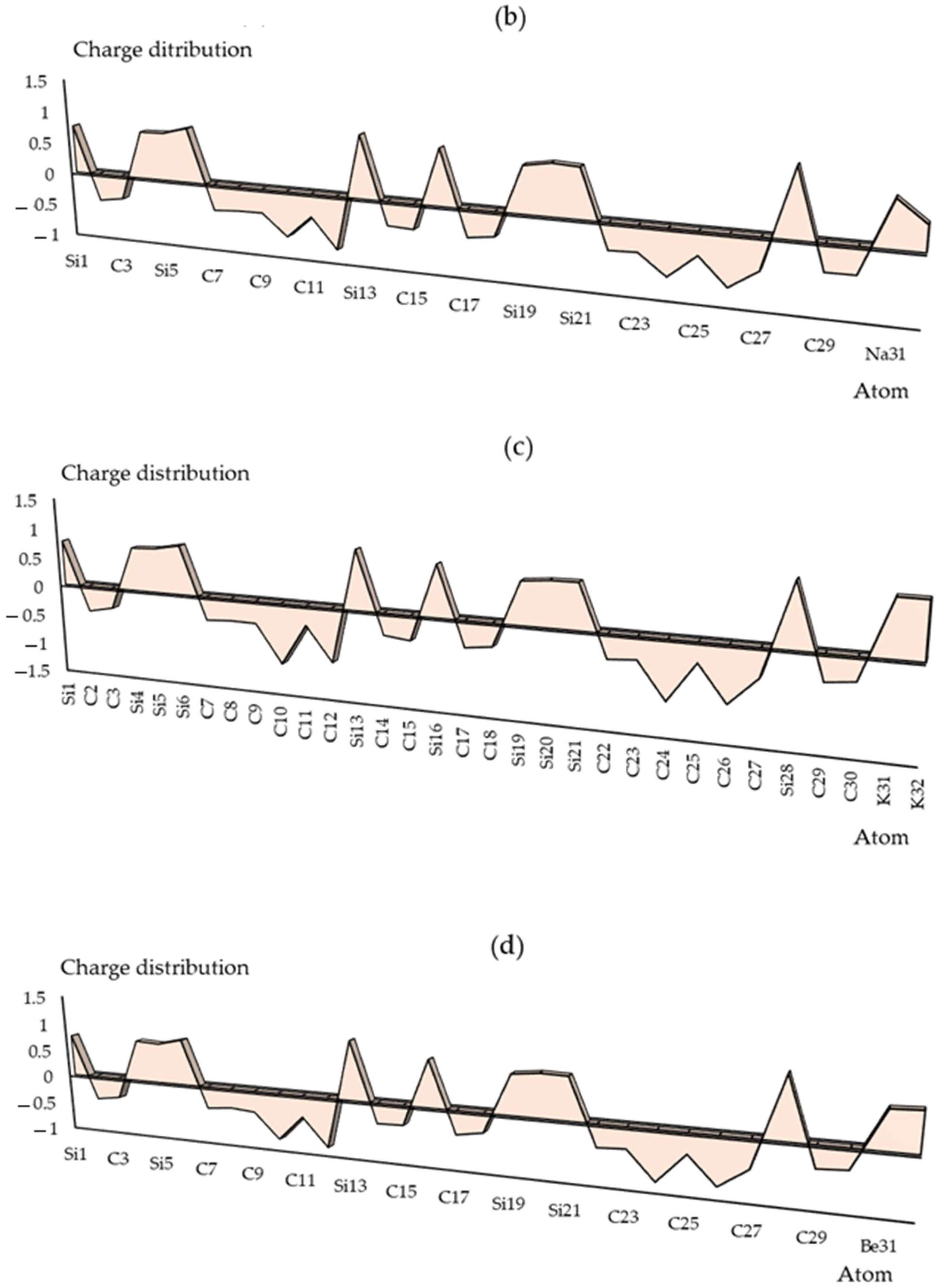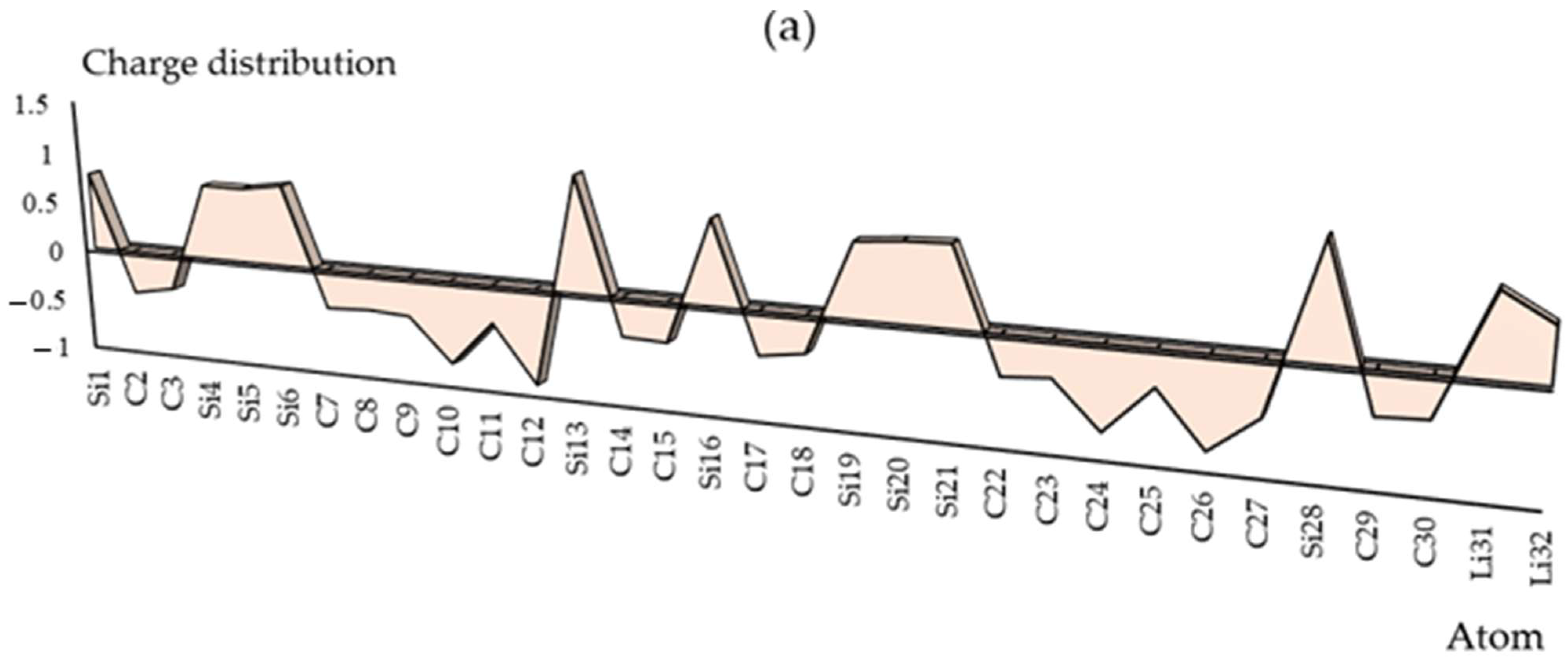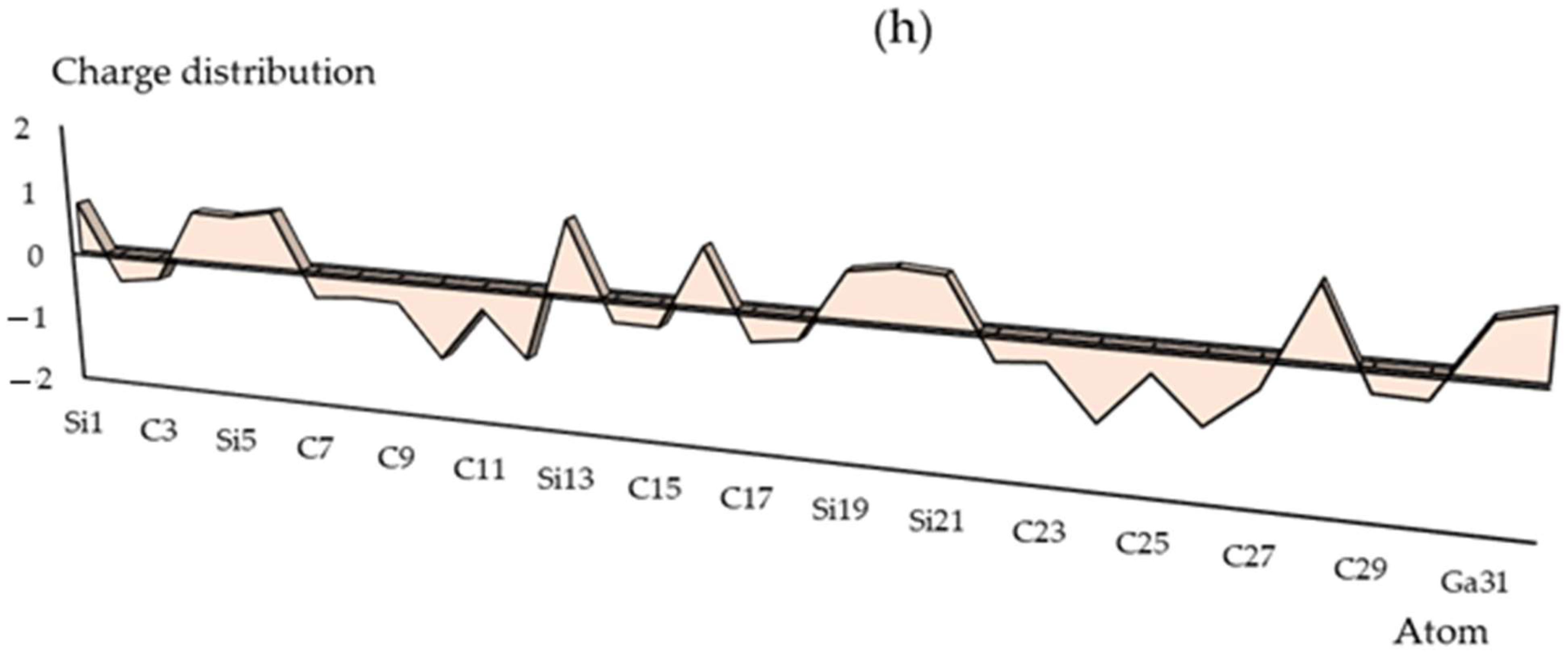 In Supplementary materials Figure S1 a–h, the charge density differences (CDDs) [33] are shown for SiLiC, SiNaC, SiKC, SiBeC, SiMgC, SiBC, SiAlC and SiGaC nanoclusters with vibration in the district about −12 to +9 Bohr through co-interaction between Groups 1,2,13 metals of Li(31)–Li(32), Na(31)–Na(32), K(31)–K(32), Be(31)–Be(32), Mg(31)–Mg(32), B(31)–B(32), Al(31)–Al(32) and Ga(31)–Ga(32). Moreover, the elements of C(2), C(3), C(7)–C(12), C(14), C(15), C(17), C(18), C(22)–C(27), C(29) and C(30) from SiLiC, SiNaC, SiKC, SiBeC, SiMgC, SiBC, SiAlC and SiGaC nanoclusters displayed a vibration of about −12 to +9 Bohr (Figure S1 a–h).