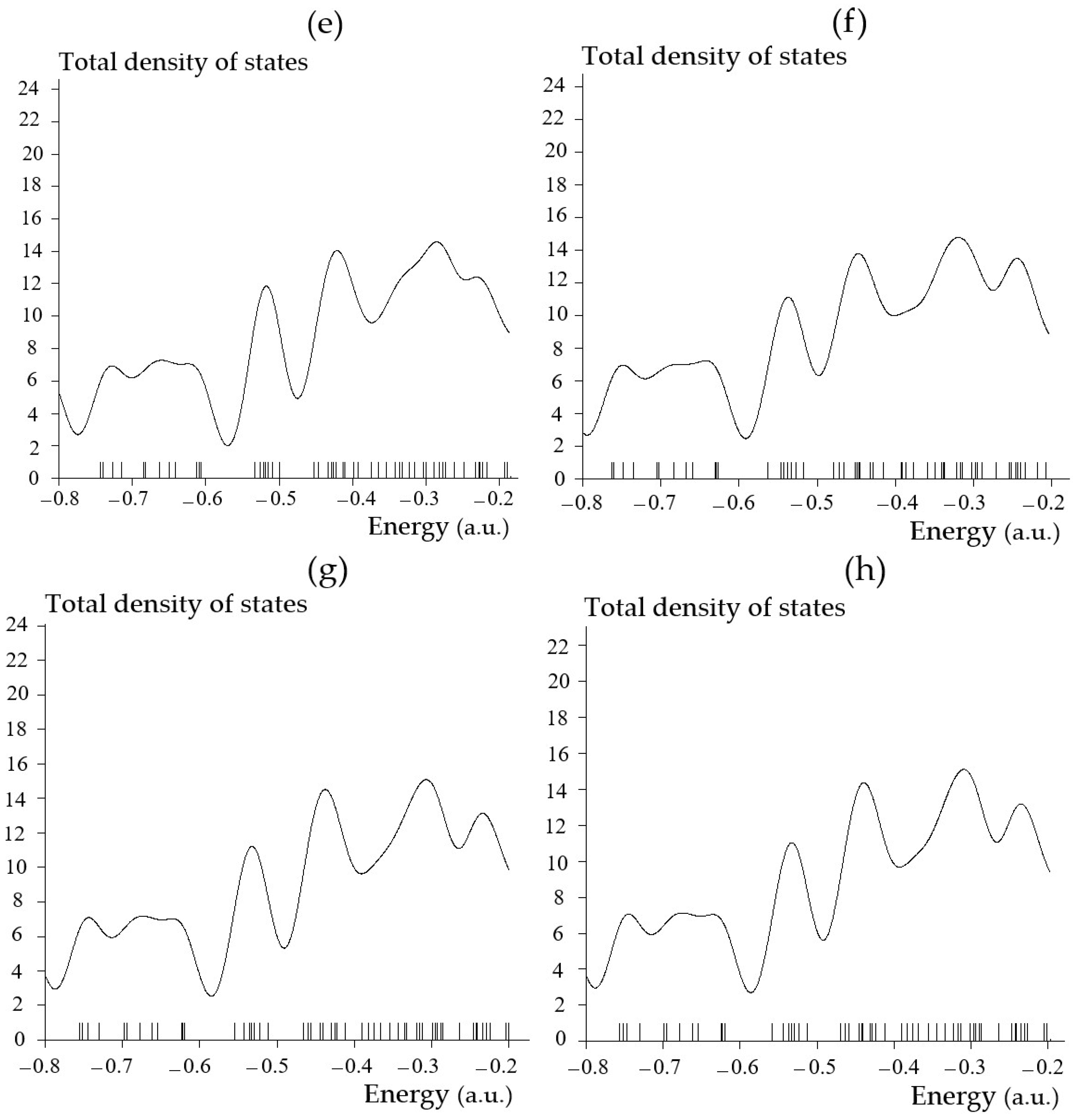 Figure 3. The graphs of total density of states (TDOSs) graphs versus energy (a.u.) of (a) SiLiC, (b) SiNaC, (c) SiKC, (d) SiBeC, (e) SiMgC, (f) SiBC, (g) SiAlC and (h) SiGaC nanoclusters.