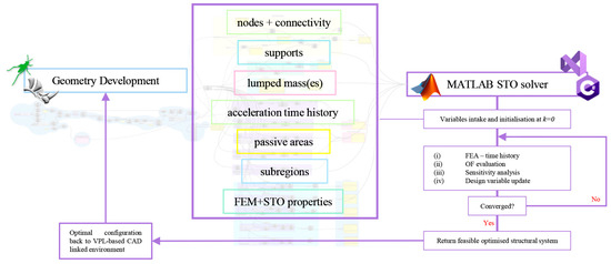 Initially, the user must determine the initial design space Ω (e.g., façade of a tall building) to be optimised and create the mesh system using the VPL-CAD linked tool. Consequently, from the generated mesh, the nodes and the system’s connectivity are retrieved like in a typical FEM formulation. It is then required to define the boundary conditions, i.e., type and location of supports, lumped mass in the system, and ground acceleration-related data. Additional design functionalities are provided by selecting specific areas to be maintained as solid (ρ = 1 ∈ Ω) in the optimisation process (i.e., passive areas) and by controlling the final volume ratio in predefined subsets of the initial design space. The next step is defining the FEM and optimisation properties; major details can be found in Section 3.1. The optimised layout visualisation is carried out by setting a threshold (Thr), which is defining the existence or not of a mesh element in the final structure. By culling only the existing elements post-STO from the initial configuration, it is possible to retrieve the FEs in the VPL (Section 3.2). The described workflow is shown in Figure 1.