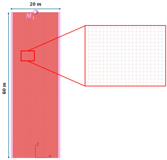 This section presents case studies on the dynamic STO application in tall buildings employing the developed VPL framework. All numerical examples are restricted to 2D plane-stress models, consistent with façade-like geometries on the XZ plane. Therefore, the current release is limited to two-dimensional meshes. The focus is minimising the square displacement at a target DOF, as outlined in Equation (1) for Single Degree of Freedom (SDOF) systems. In Multi-Degrees of Freedom (MDOFs), the OF minimises the sum of the square displacements of each DOF. The numerical test cases in Section 4.1 and Section 4.2 involve a tall building with a quadrangular base measuring 20 × 20 m and a height of 60 m. Various parameters and filters are varied during the analysis. The building’s façade is initially defined as a surface, then divided into regular quadrangular FEs using the Lunchbox© plug-in in GH. In this case, the surface is divided into 80 × 240 quad-panels, generating 19,200 FEs (Figure 3).