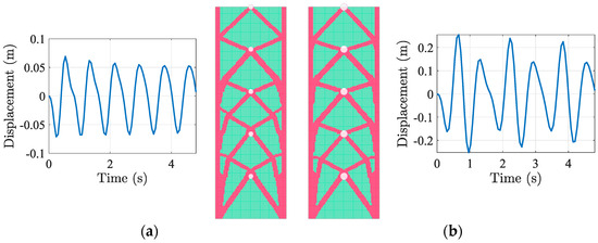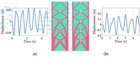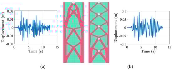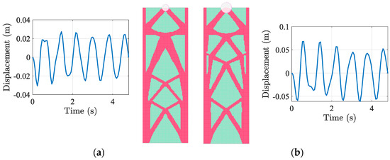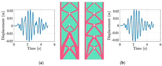 In this study, the dynamic optimisation problem incorporating time history analysis is addressed, where the external forces can be represented as sinusoidal functions or data from real earthquake ground motions. The objective is defined as the minimisation of the squared displacement at selected DOFs (Equation (1)). This choice, rather than the more common dynamic compliance, directly addresses façade drift under seismic and dynamic excitation, a key performance indicator in engineering and architectural design. By focusing on critical DOFs, the objective provides a physically meaningful link to serviceability criteria (e.g., inter-story drift limits), ensuring that the optimised topology is directly interpretable in practice. The dynamic STO problem is formulated as follows: