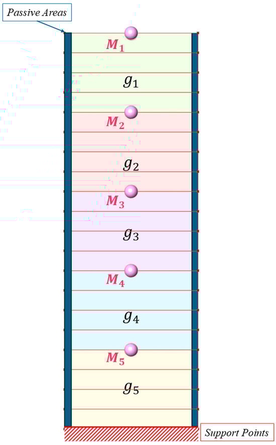 where are, respectively, the acceleration, velocity, and displacement vectors. The matrices M, C, and K denote the mass, damping, and stiffness matrices, respectively, while Ft represents the external dynamic forces (e.g., seismic ground motion) [32,33,34]. In this formulation, the imposed ground acceleration acts through the external load vector , which represents the equivalent inertial forces transmitted from the foundations to the structure