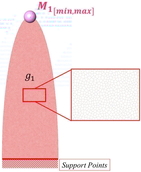 This subdivision is empirically calibrated to ensure satisfactory mesh discretisation, yielding accurate results during the optimisation. Additionally, the filter radius size setting (rmin) is also taken into account. The rmin is applied after computing the elemental criterion to mitigate the occurrence of a checkerboard pattern in the optimised solution. This filter modifies the elemental criterion of a specific element by calculating a weighted average value within a specified neighbourhood. The user determines the rmin, which should exceed the size of the smallest FE to be effective (Figure 4). Adjusting the filter radius size enables control over the minimum size of the resulting features within the design domain [60], generally preventing compression-dominated regions from becoming overly thin.