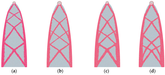 where , , k is the iteration index, and Niter is the maximum number of iterations. The optimisation process terminates when the relative variation of the OF between consecutive iterations falls below 10−4, or when the maximum number of iterations (Niter = 200) is reached. These settings follow the standard practices in density-based TO [9,20,49].