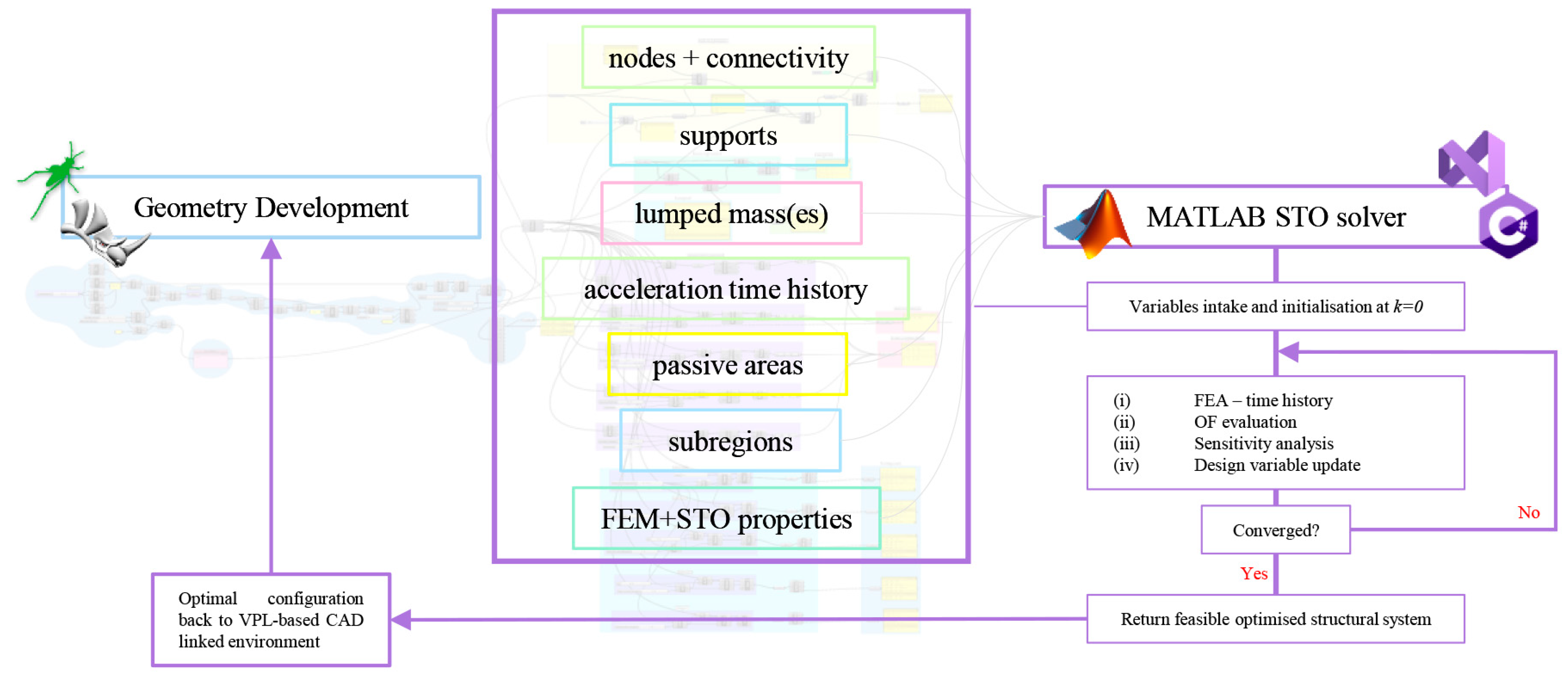 20]. However, existing implementations remain primarily confined to research-oriented or MATLAB-based environments, limiting accessibility for design practitioners. Currently, no CAD-integrated or VPL-based framework has been presented that enables dynamic STO with time-varying loads and adjoint sensitivities directly within an architectural modelling ecosystem. This context underlines the need for CAD-compatible dynamic STO methods, which motivates the development of the framework proposed in this study. To address this gap, we present a comprehensive Visual Programming Language (VPL) framework for dynamic STO within Grasshopper (GH) for Rhino3D. The framework integrates an open-source MATLAB-based solver adapted from Giraldo-Londoño et al. (2021) [