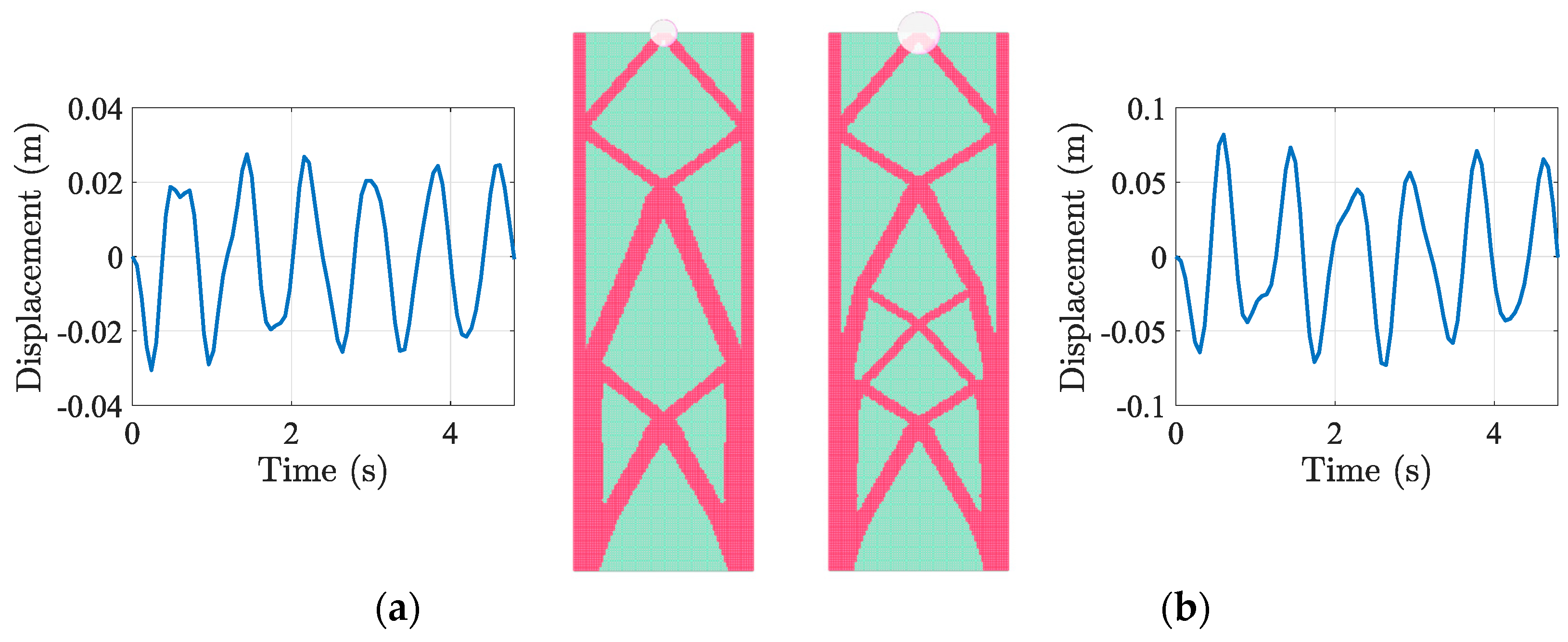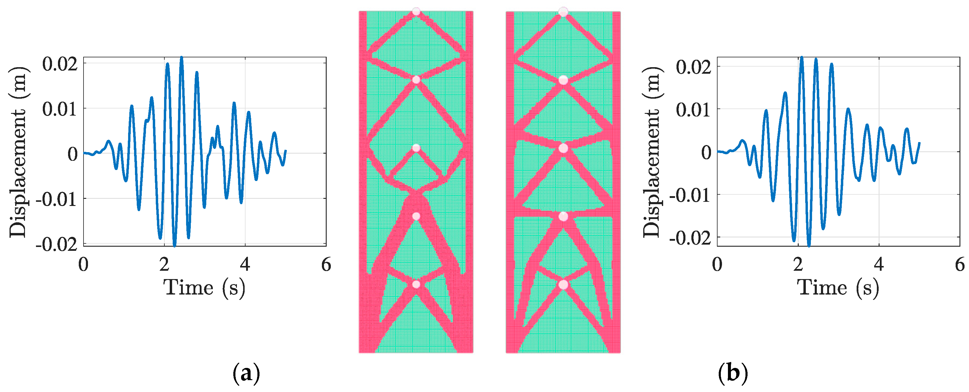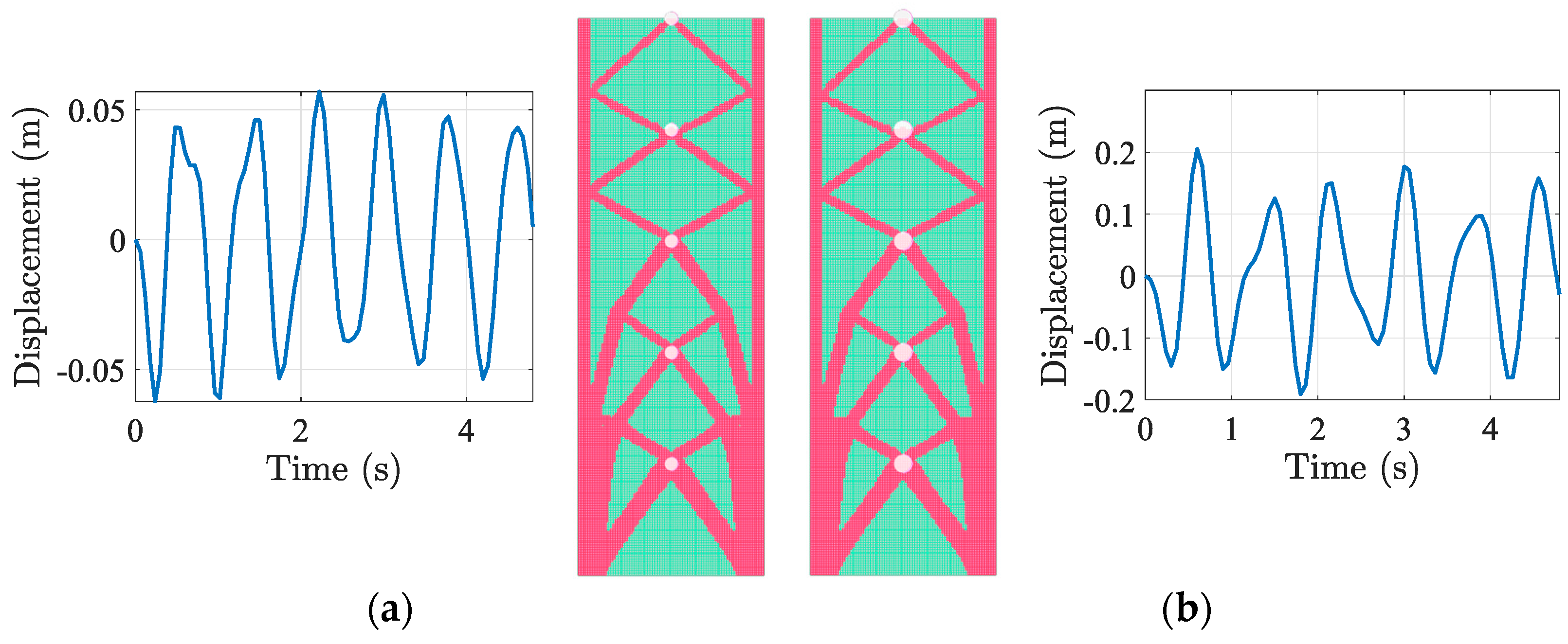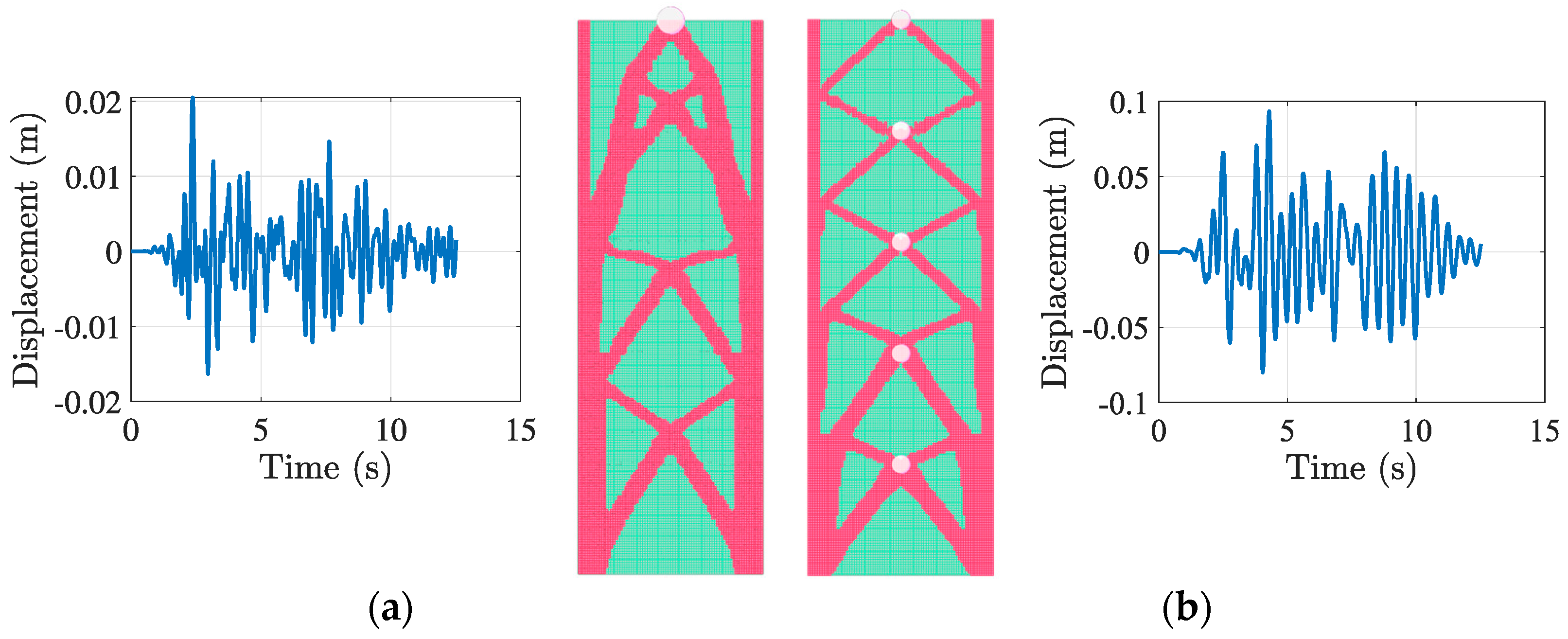 Figure 16b), the topology (a) displayed alterations due to variations in frequency content. The solver demonstrated effective adaptation to various earthquake stimuli while balancing material usage and displacement control, highlighting its practical applicability across different seismic regions.