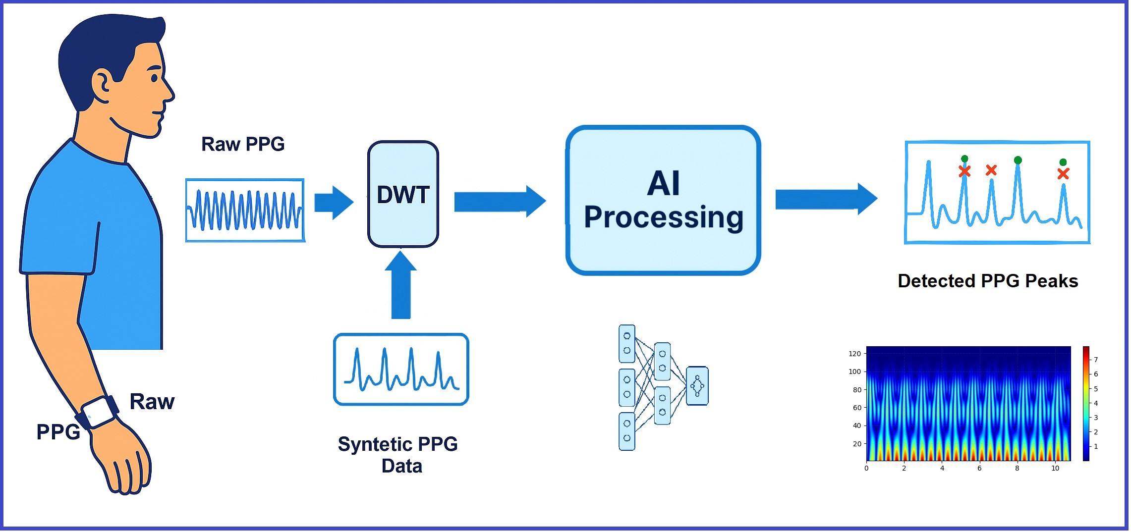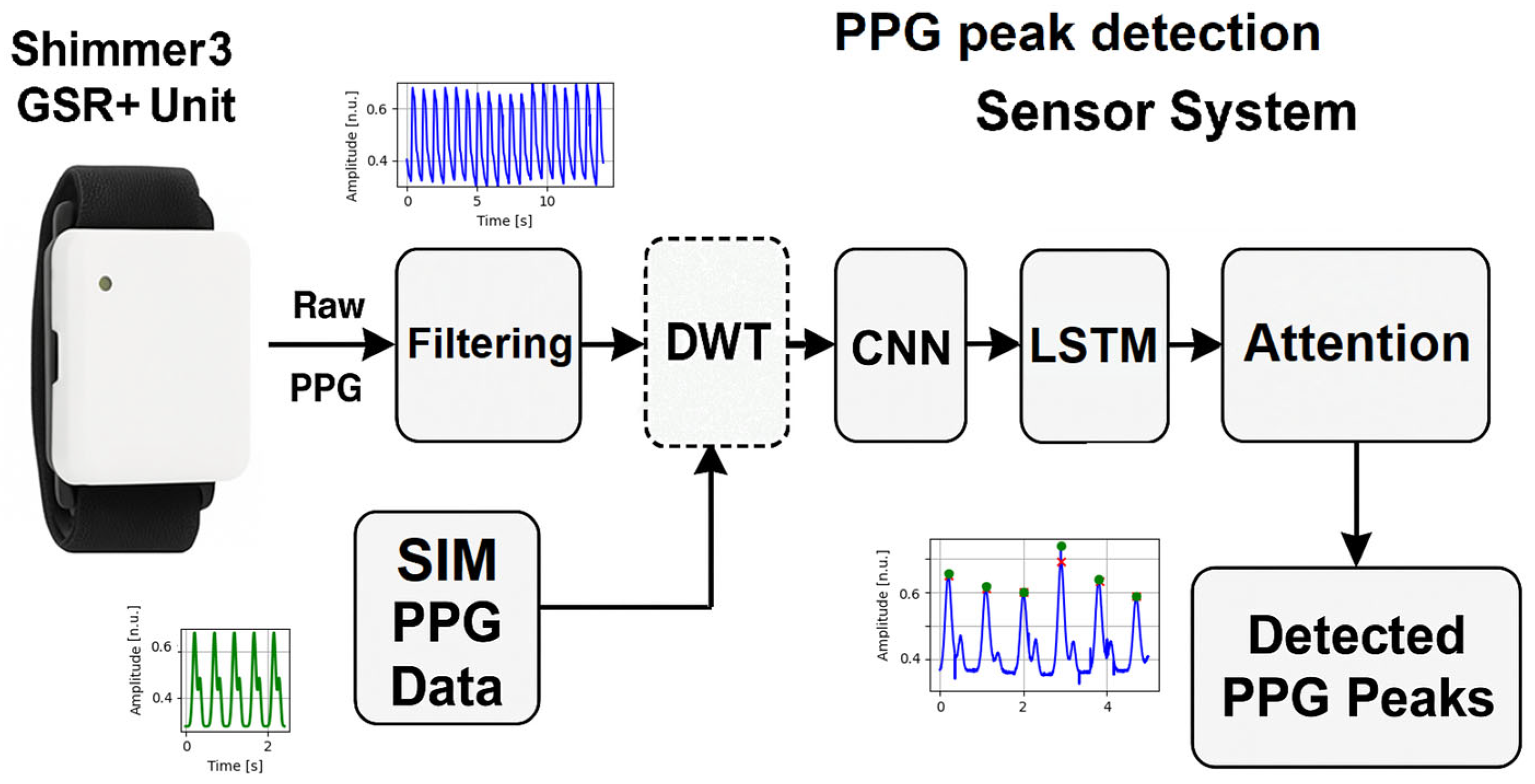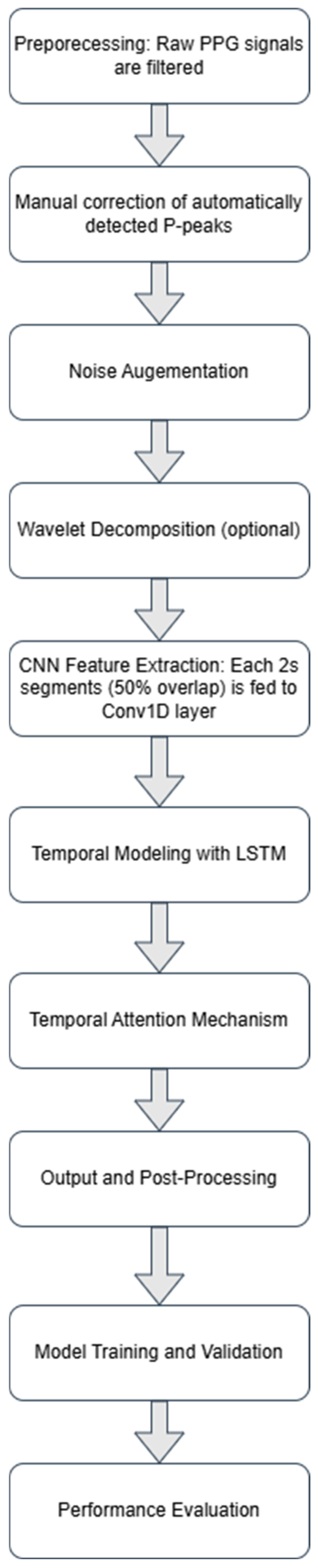 Table 3) integrates convolutional, recurrent, and attention layers in a sequential hybrid configuration designed for robust P-peak detection from PPG signals. The model receives as input either a 2 s PPG window with DWT coefficients level 3.