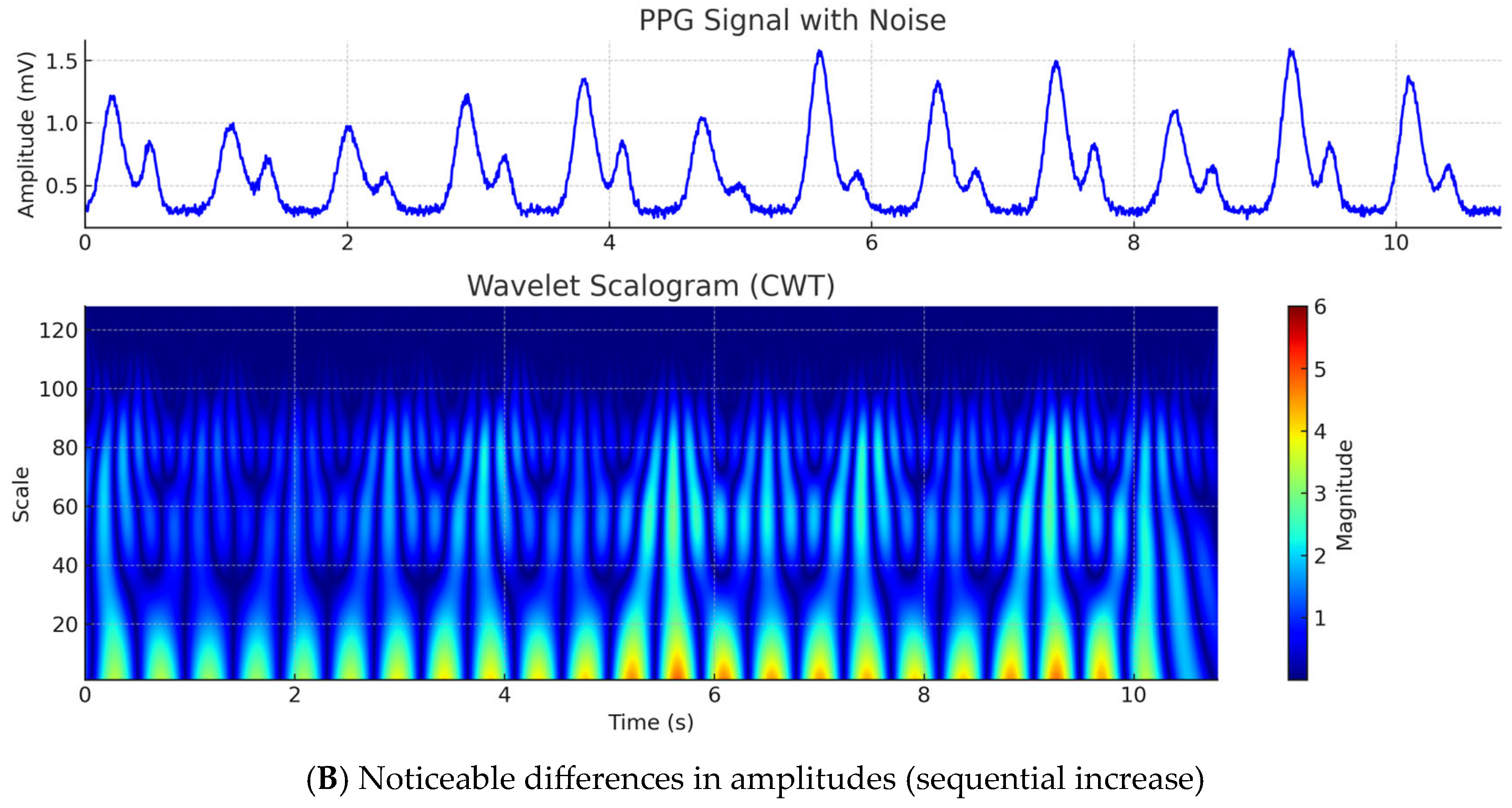 Noise Augmentation: Noise components such as baseline wander, muscle artifacts, and 50/60 Hz power line interference are added to improve the model’s robustness to real-world conditions.
