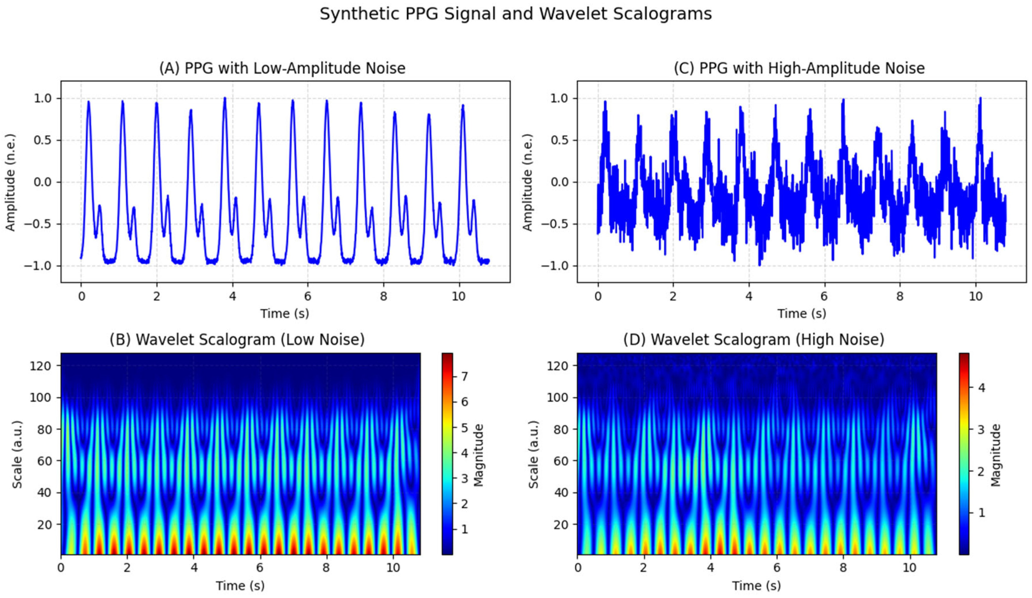 DWT with Daubechies wave function with 4 coefficients db4, which is suitable for biomedical signals, with 4 levels of decomposition, is applied. In a previous study by the author, it was experimentally and quantitatively demonstrated that the Db4 wavelet with decomposition level 4 provides optimal performance for PPG peak detection, balancing time–frequency resolution and noise sensitivity [