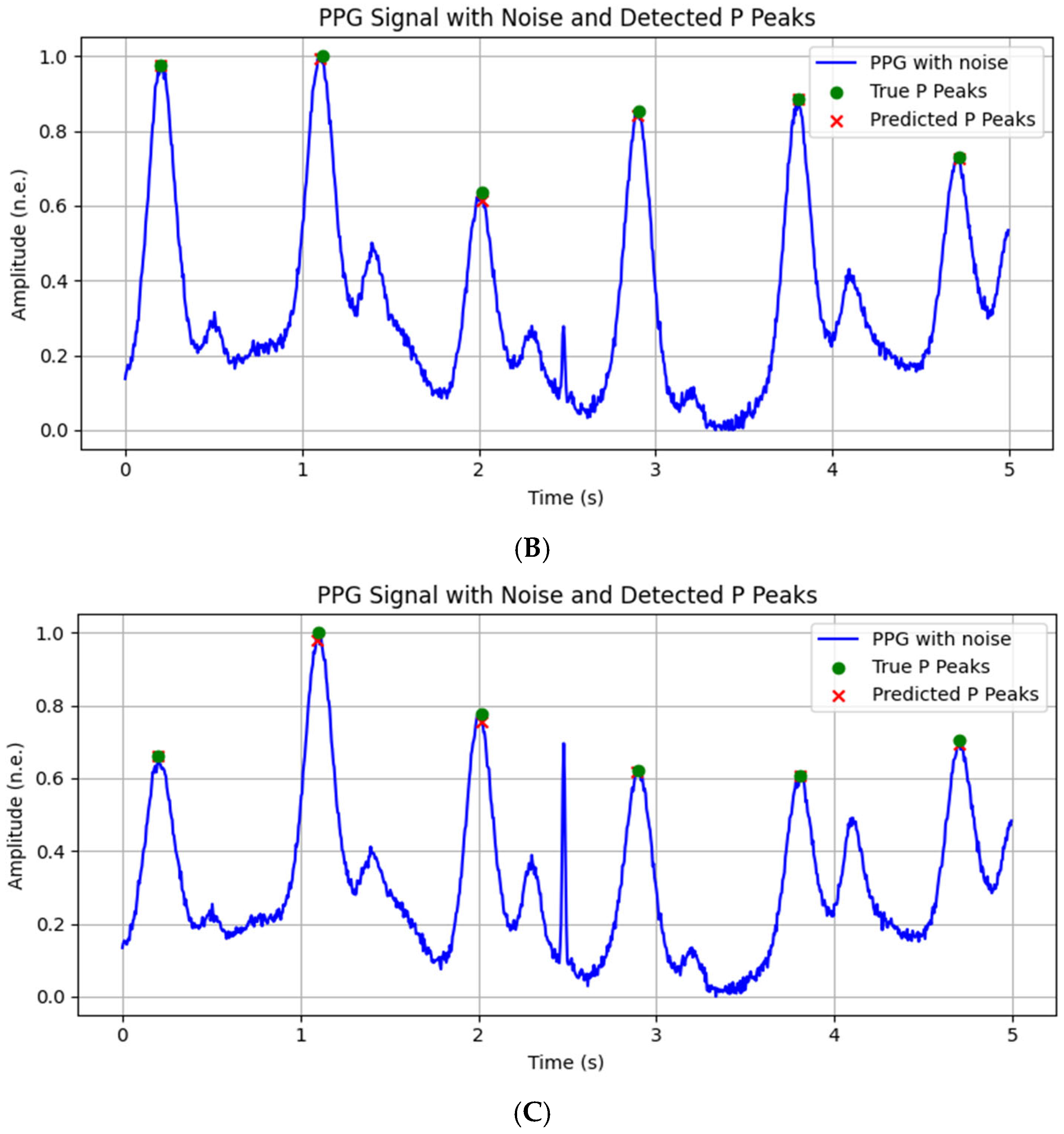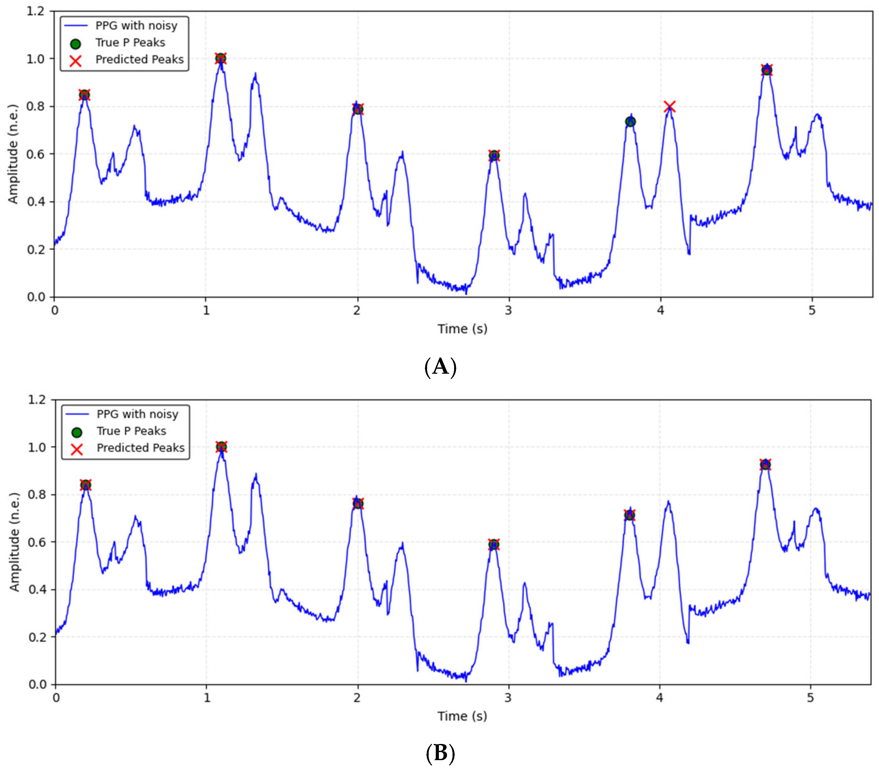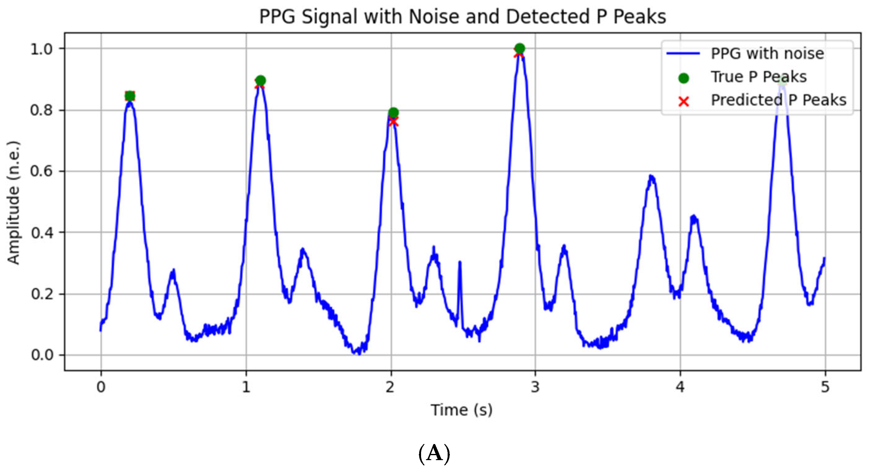 Filtering of Results: Incorrectly detected peaks that do not correspond to local maxima in the signal are removed, and duplicate peaks are eliminated. The peak removal algorithm checks whether each predicted event corresponds to a true local maximum in the filtered PPG signal. If the predicted peak is not a local maximum or falls outside a ±50 ms window of an annotated or valid peak, it is rejected. Potential peak candidates within 200 ms are merged into a set, and the one with the highest amplitude is selected from this set.